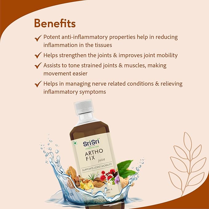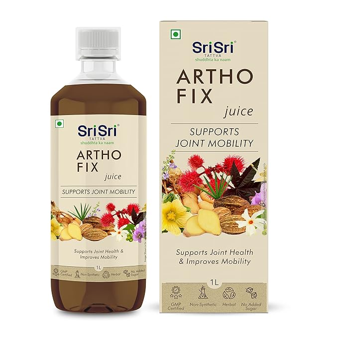 Ayurveda herbs are known to treat Joint disorders efficiently for thousands of years now. Artho Fix juice is a blend of potent herbs like Eranda, Sahachara, Nirgundi, Punarnava which help reduce inflammation while supporting & strengthening the joints. Fix your joint health with the power of 11 Herbs and improve mobility. Stock up on your antioxidants and reduce inflammation in your body. Ingredients Nirgundi Shunti Erandamoola Haritaki Bala Sahachara Shati Musta Rasna Punarnava Parijata Citric Acid Potassium Sorbate Sodium Benzoate Directions for Use Add 30ml of Artho Fix Juice to 100ml of water and mix well. Drink twice a day, preferably on empty stomach or as advised by your Vaidya / Nutritionist. Net Weight: 1L