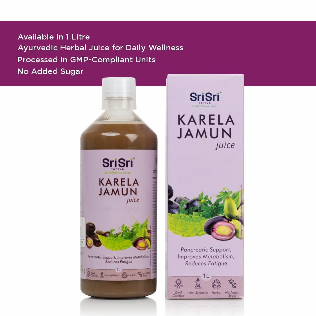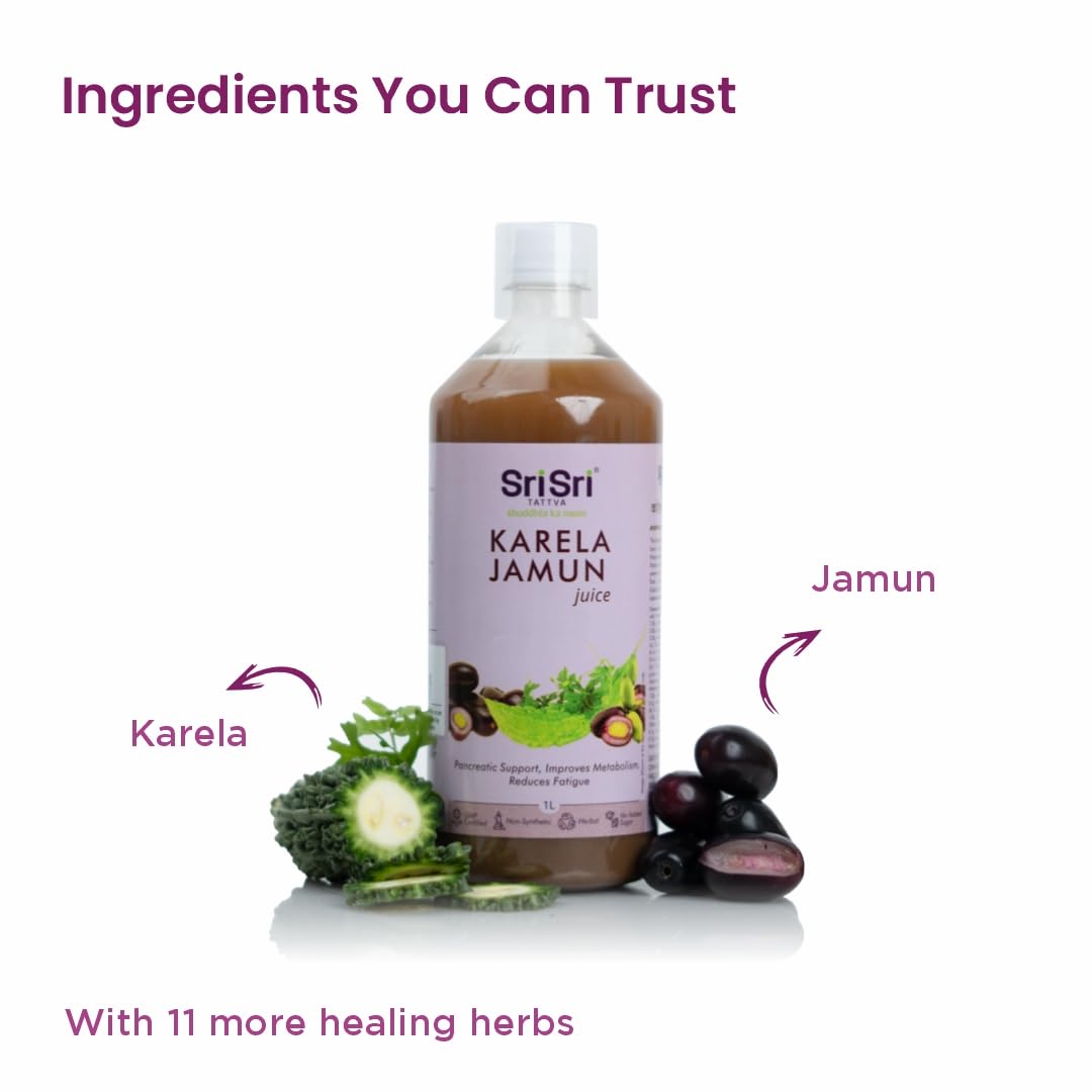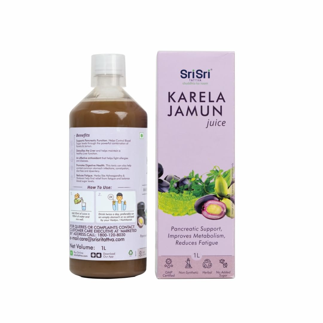 If there's a match made in (nature) heaven it has to be of Bitter Gourd and Jamun. There are endless health benefits of Karela Jamun Juice and more so for people with diabetes. Here's why Karela Jamun Juice should make it into your diet: - Karela or Bitter Gourd is rich in phytonutrients like minerals vitamins and antioxidants and has a hypoglycemic agent called "Charantin" that regulates natural sugar levels in the body. - Jamun fruit regulates the body's metabolism by converting starch into sugar and prevents sudden sugar spikes and is also a rich source of Vitamin A and Vitamin C. Quick fact: Both Karela and Jamun are used in Ayurvedic practices for centuries and are safe to consume. Are there more benefits I should know about? Yes. - Want flawless skin & hair? Karela Jamun Juice is here to your rescue. - Helps to curb your appetite and manage weight. - Best for cleansing and detoxifying your liver and kidney. - Lowers bad cholesterol in the body to ensure heart health. - Speeds up digestion and prevents acid reflux. Got it! But why should I choose Sri Sri Tattva and not others? Here's the biggest reason: Our juice is made up of raw herbs and not extracts. That means it's plant-based with nothing added and removed. No added sugar artificial flavours artificial colors or synthetic vitamins and minerals. Just pure goodness of bitter gourd and Jamun. Moreover it's certified by AYUSH MINISTRY Government of India for quality and safety standards. Great! How do I consume it? Mix 30 ml of juice in either 100ml water or fruit juice and drink it up. You can have it plain too if you want.