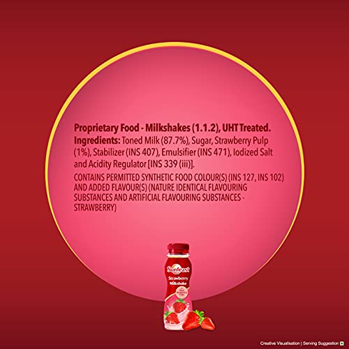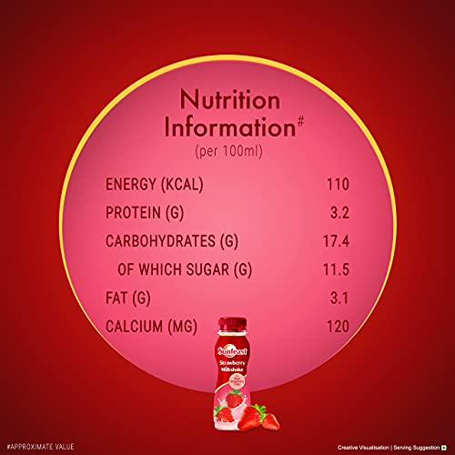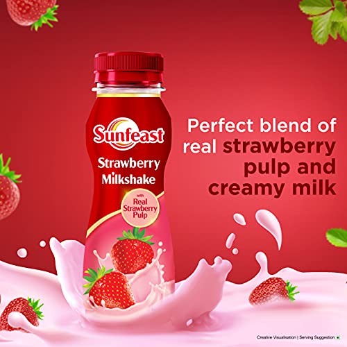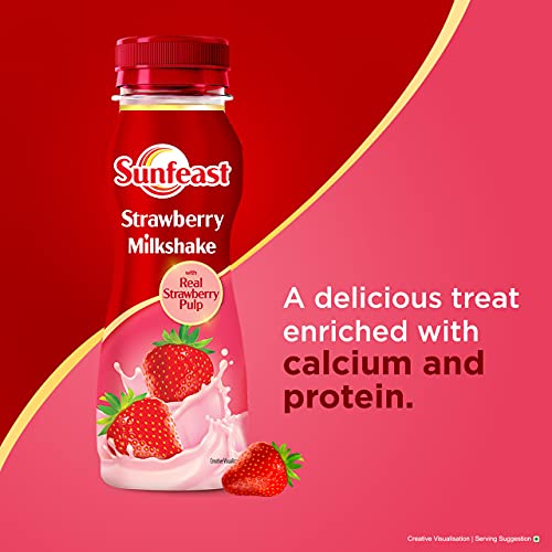 Thick creamy and utterly deliciousâSunfeast Strawberry Milkshake is crafted with fresh strawberries making it a heavenly indulgence for every strawberry lover. Each sip takes you to a Strawberry Land where your cravings are perfectly satisfied. Savour the burst of flavour with every cool refreshing sip. Sunfeast Strawberry Milkshake is the perfect remedy for those persistent milkshake cravings. Experience an abundance of strawberry richness that makes for an unforgettable indulgence. This delightful milkshake treat is perfect for both kids and adults. Enjoy the perfect blend of real strawberry pulp with the goodness of milk enriched with calcium and protein. With every sip youâll dazzle your taste buds while nourishing your body. When youâre feeling low this strawberry milkshake is the ultimate mood lifter. Whether itâs a monotonous day at work or a dull afternoon at home grab a bottle of Sunfeast Strawberry Milkshake and inject some excitement into your day.