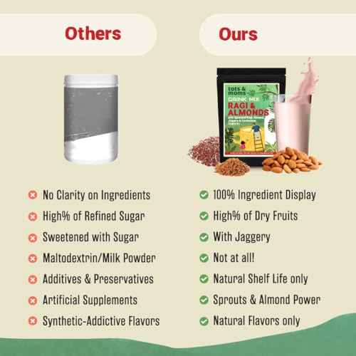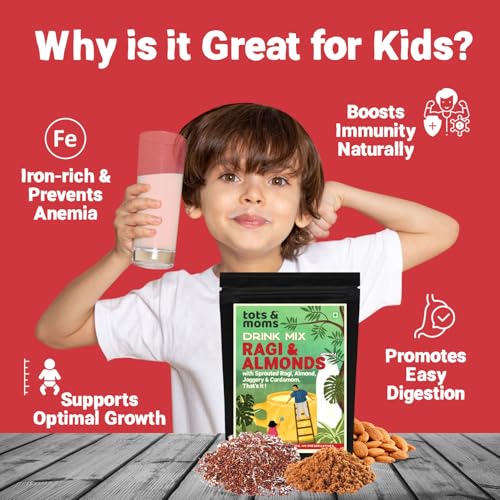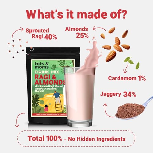 Tots and Moms Sprouted Ragi and Almond Drink Mix are superfoods the nutrient values of which are enhanced several times more with the process of sprouting that releases essential nutrients. With 10x times the calcium of milk Ragi or finger millets is a powerhouse of nutrition while Almonds are loaded with good fats and proteins. Together they are a rich source of energy help in weight gain boost immunity and aid good digestion. The best way kids can enjoy them is as a drink made by mixing this powder with hot milk and served warm.