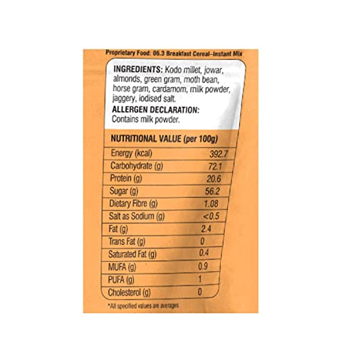 Millet Badam Health Drink: · Country of Origin: India · Kodo Millet High in Protein and helps in weight management Vitamins(which?) · Sugar free no preservatives no artificial colors are added · Cholesterol & Trans Fat Free · Fit for all age(Toddlers to Aged People) · Badam helps in managing blood sugar levels reducing blood pressure lower cholesterol levels. · Delicious and Healthy · Can be consumed with Water or Milk · Extract: Milk powder Badam Kodo Millet Jaggery Green gram Cardamom Jowar.