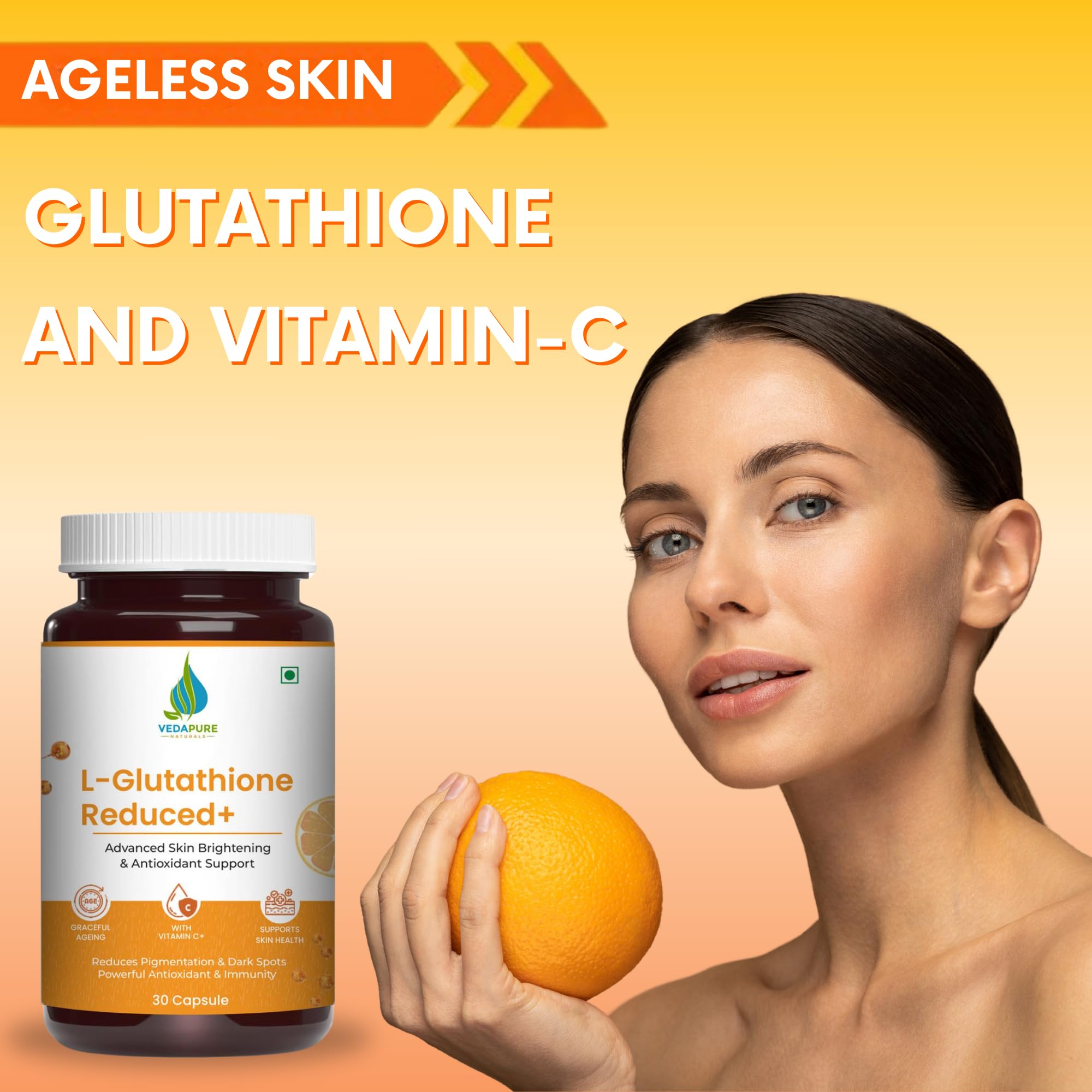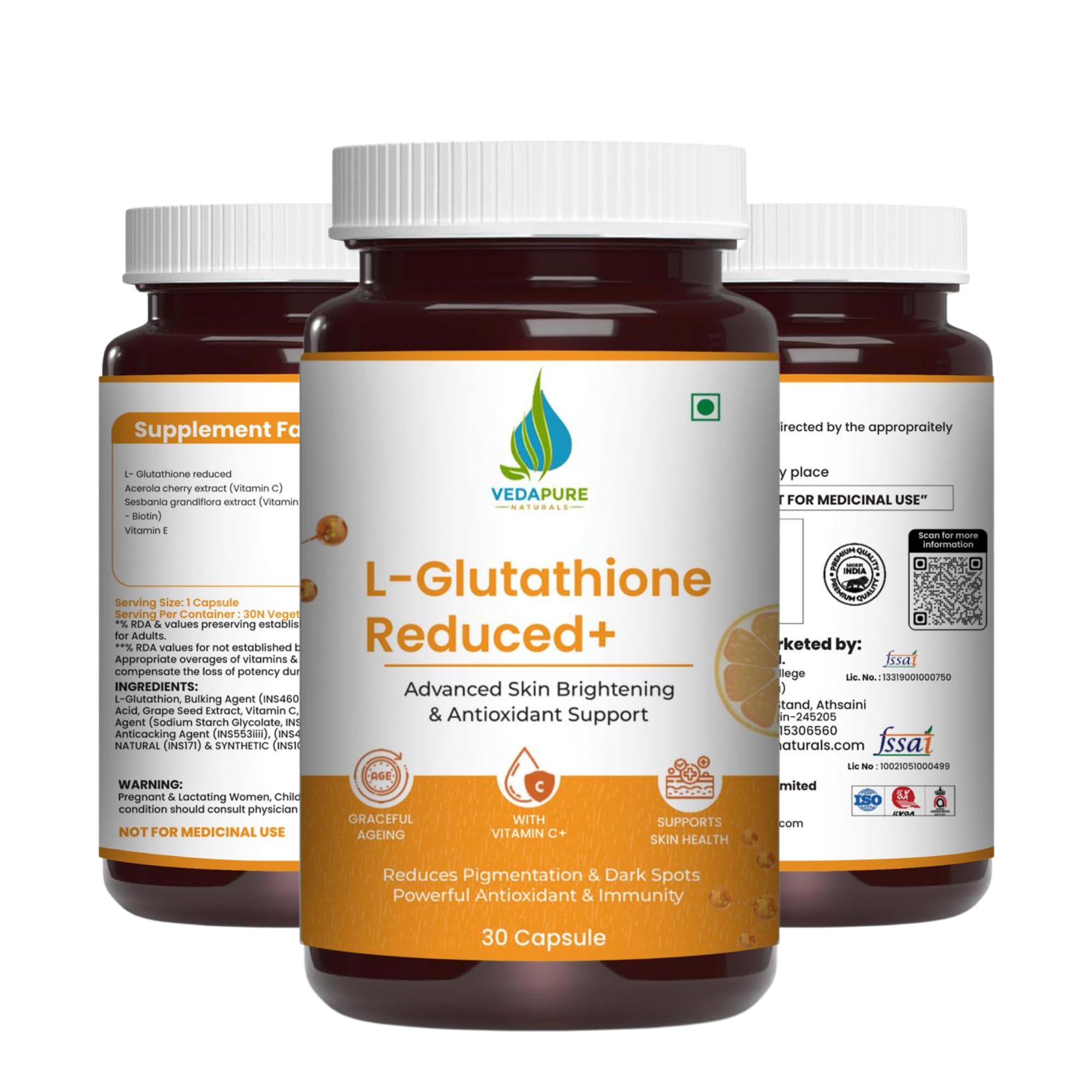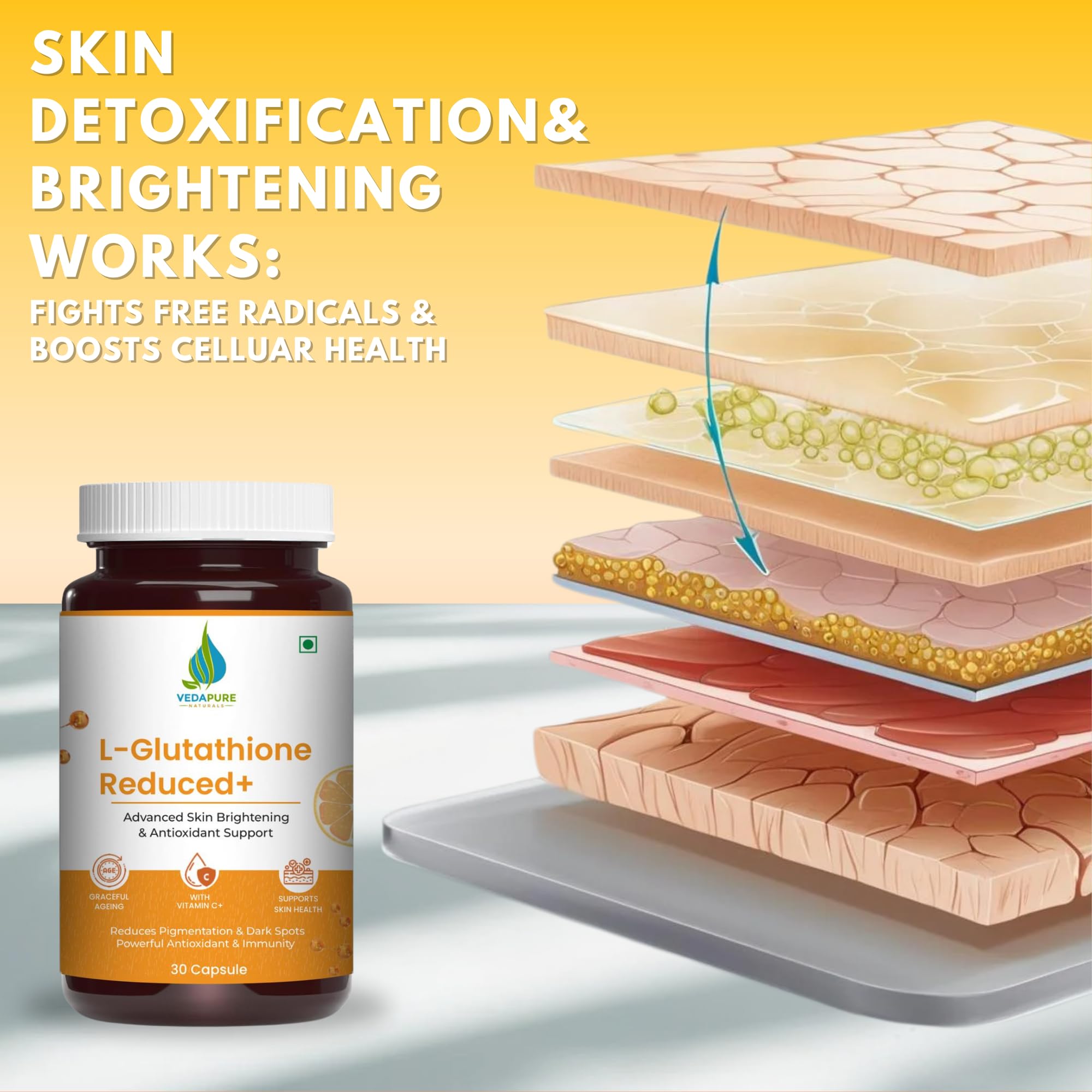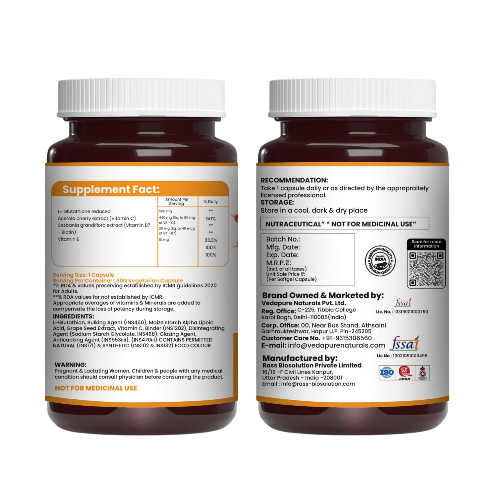 Vedapure L Glutathione Capsules with Vitamin C & E for Men & Women | Antioxidant Glutathione Effervescent Capsule for Healthy Skin Liver Detox Immune Support Hydration | 30 Capsules (Pack of 1)
