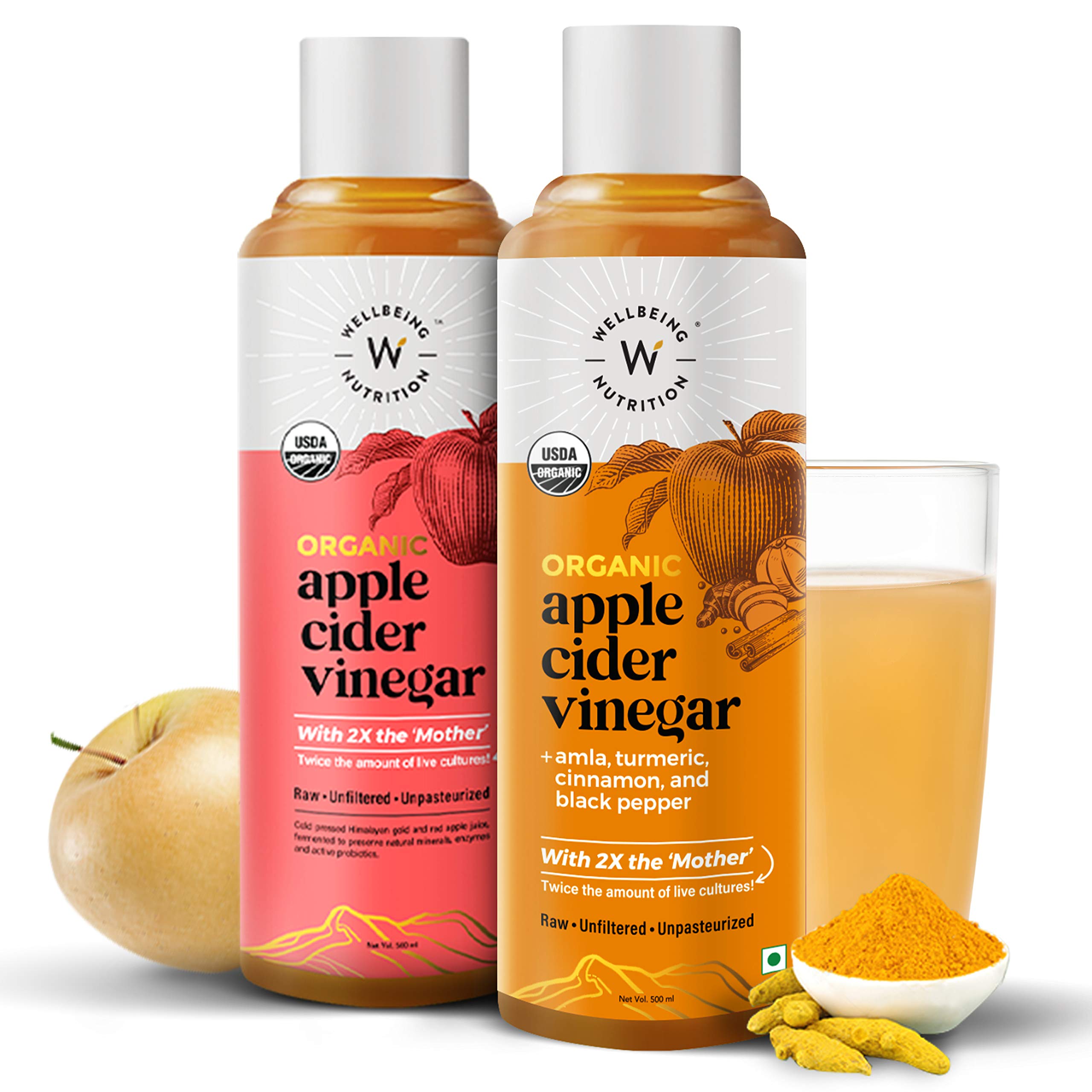 Organic Apple Cider Vinegar Raw Unfiltered and Unpasteurized with 2x the mother! Made from Gold and Red Himalayan apple juice not from concentrate. We source ferment and bottle our ACV strictly following the USDA Organic certification guidelines to ensure maximum purity and potency. Choose the Gold Standard of ACV for maximum results! Wellbeing Nutrition’s Organic Apple Cider Vinegar is a blend of handpicked Himalayan Gold and Red apples with the additional goodness of Amla Turmeric Cinnamon and Black Pepper. Made using a combination of ancient Vedic science and modern fermentation technology our ACV is raw unfiltered and unpasteurized and contains 2x the ‘Mother’ a colony of friendly bacteria that give your body essential proteins and enzymes. These extra ingredients in Wellbeing’s Apple Cider Vinegar not only double its detoxifying effects on the body but also helps and supports in enhancing skin health improving oral health.