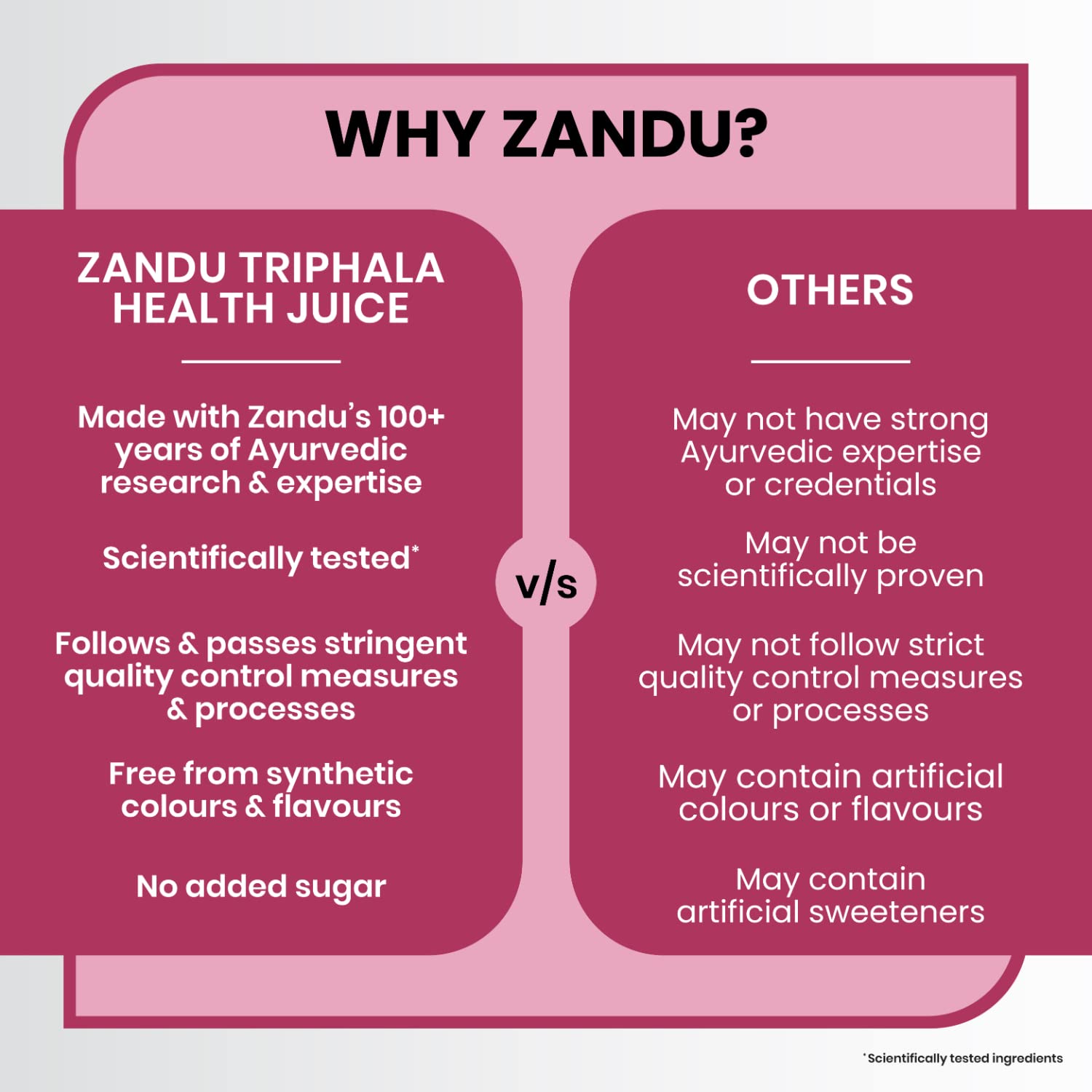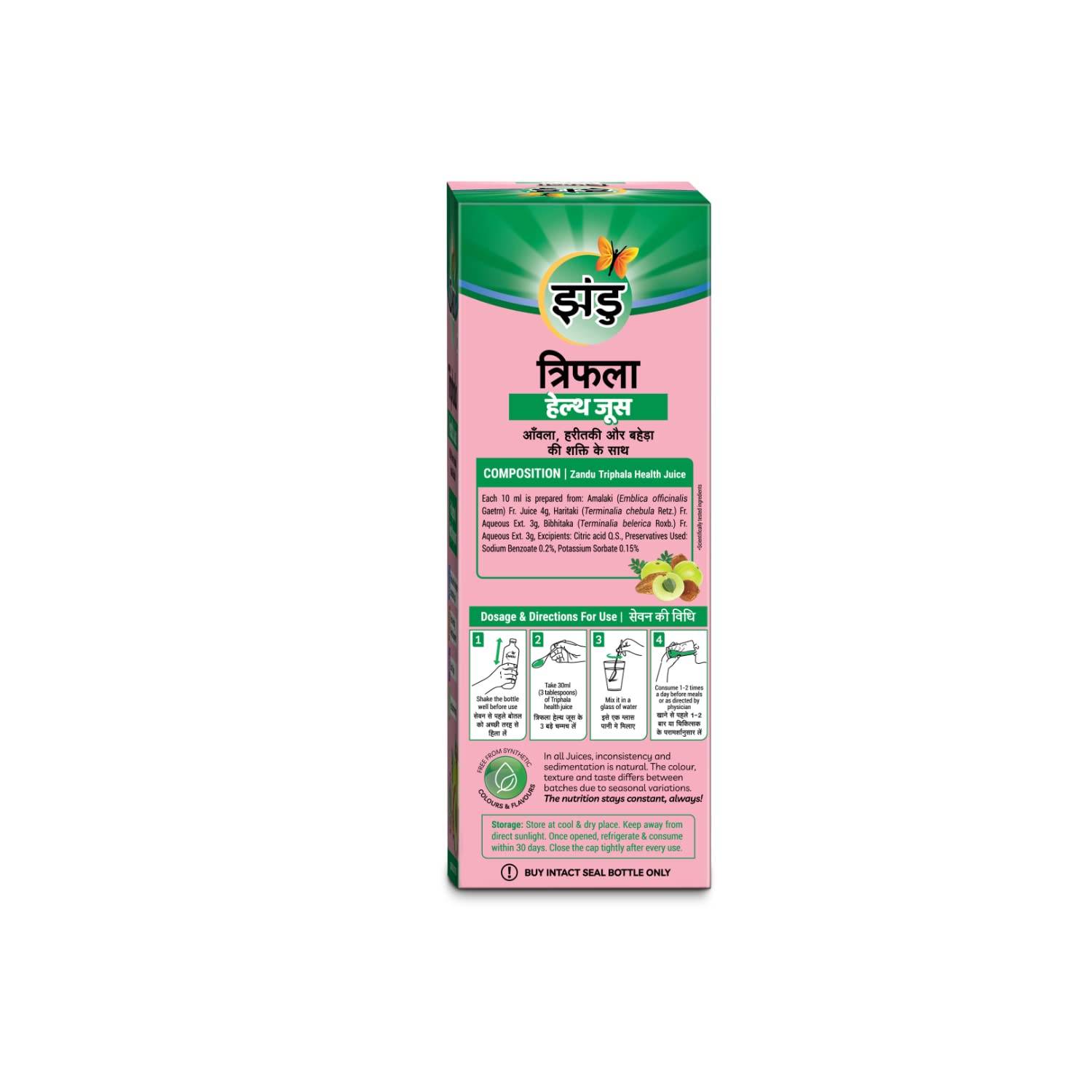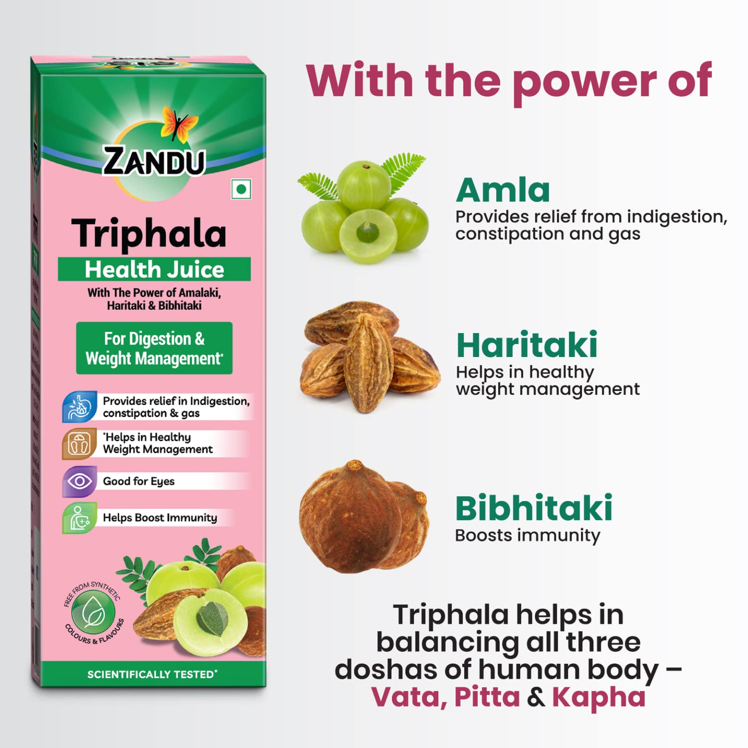 Zandu Triphala Health Juice is an Ayurvedic Health Juice. Triphala constitutes the goodness of three fruits - Amla Haritaki & Bibhitaki. Zandu Triphala Health Juice is made with Zandu's more than 100 years of Ayurvedic research & expertise. It is Scientifically tested. It helps provide relief in indigestion constipation & gas. Helps in healthy weight management. Is good for eyes as well as Helps boost immunity. It is free from synthetic colours & flavours has no added sugar