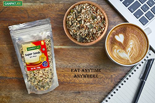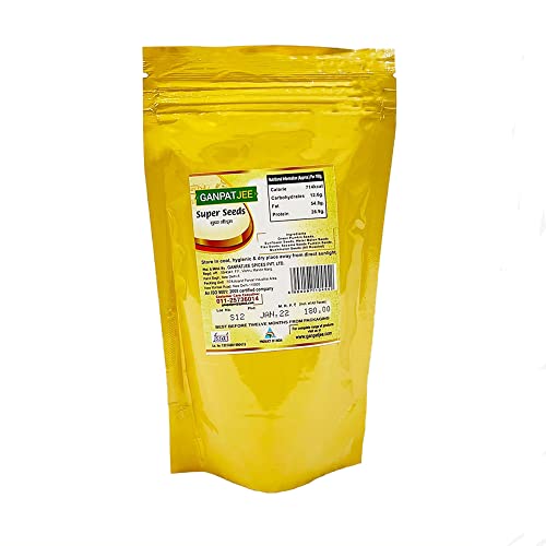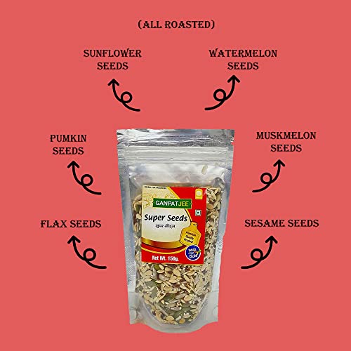 GANPATJEE Super Seeds are a healthy mixture of Seeds. It Consist of Roasted Green pumpkin seeds (kaddu magaj) Roasted Sunflower Seeds Roasted watermelon seeds Roasted Flax Seeds Roasted Sesame Seeds Roasted Muskmelon seeds.