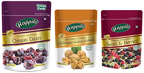 Happilo Dried Premium International Omani Dates 250gHappilo has travelled the world to get the finest gourmet dry fruits. They are one of the most nutritious dried fruits in the world they're a yummy healthy snack. Great for Snacking adding to Cereal Cooking and Baking. High Antioxidants Dietary Fiber No Gluten Non GMO Zero Trans Fat & Zero Cholesterol. Daily need products for a healthy and energetic life. Happilo Zip Lock Pouch with airtight seal to ensure the product is protected and fresh. Quality assured - Happilo products are rigorously tested against the industry's best quality standards.Happilo Premium 100% Natural Californian Walnut KernelsDried200gWalnuts are deliciously healthy and great for snacking baking or cooking. These no shell raw walnut halves are mainly grown in California and Northern India. Eating raw walnuts is one of the easiest things to do to improve your health.Happilo Premium International Whole Seeds & Berries Pouch 200 gHappilo has travelled the world to get the finest gourmet dry fruits dried fruits nuts berries and dates. Indulge into the gourmet and grocery world of Happilo with awesome natural nuts and dry fruits along with the unique dry fruit mixes fusions and flavoured dry fruits healthy seeds and dried berries specially crafted for your taste and health. Happilo dry fruit gift boxes and festive dry fruits and nuts gift pack brings health happiness and love to gift to your colleagues friends and family.