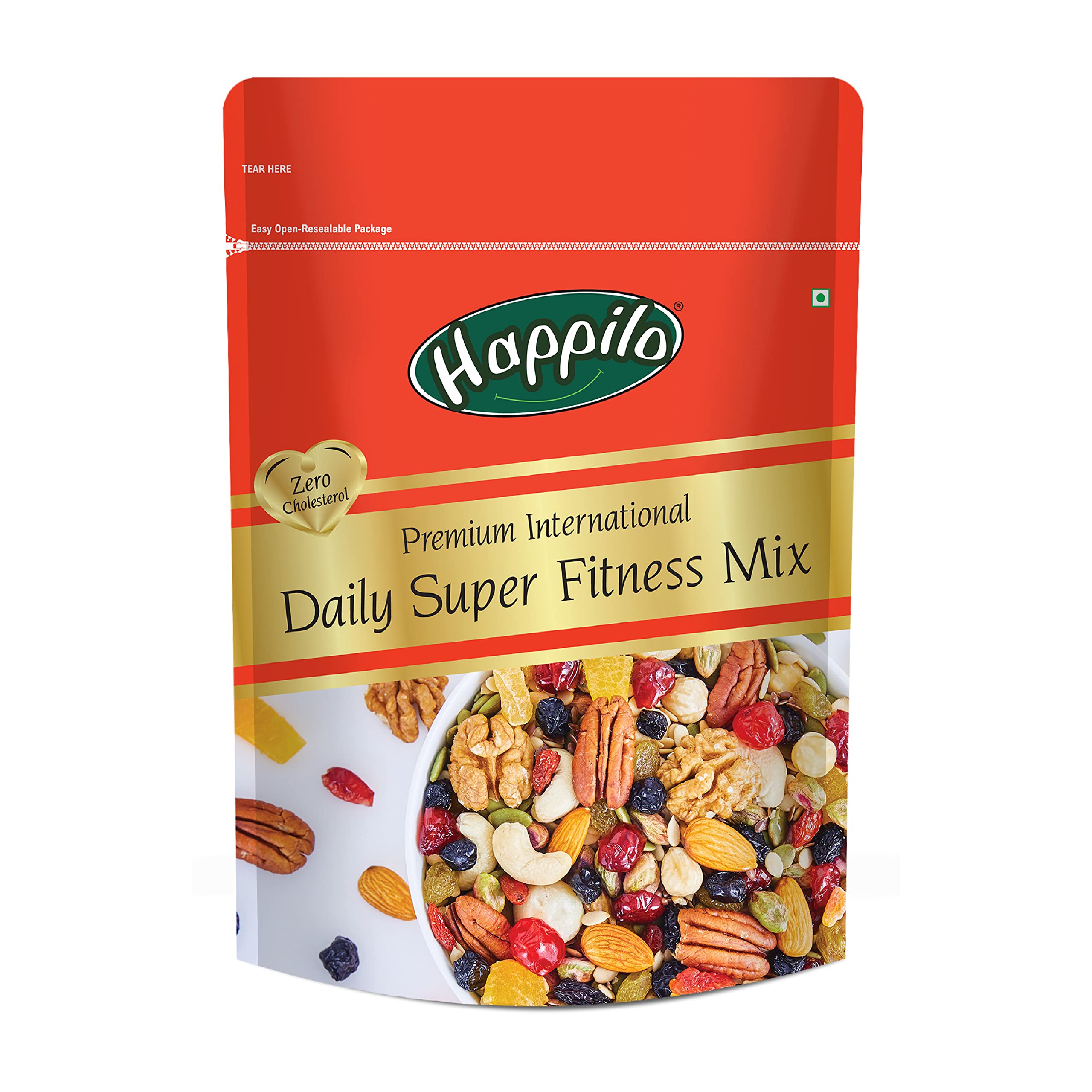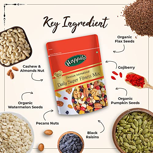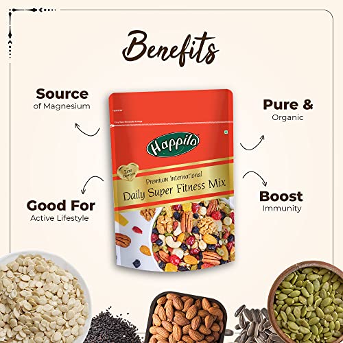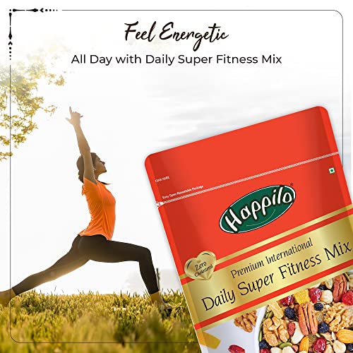 Happilo Premium International Daily Super Fitness Mix is consist of 20 assorted combo of dry fruits nuts seeds and berries for healthy snacking. This mix constitutes world-class internationally sourced nuts seeds & berries. The rich source of all essential vitamins and minerals - high in protein & calcium. An healthy evening snack or combo with your breakfast cereal or a sports mix before your workout - customize as you wish. Recommended 2 spoons daily to achieve a long-term healthy lifestyle for any age group. Quality assured - Happilo products are rigorously tested against the industry's best quality standards.
