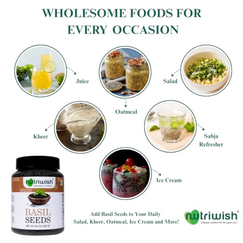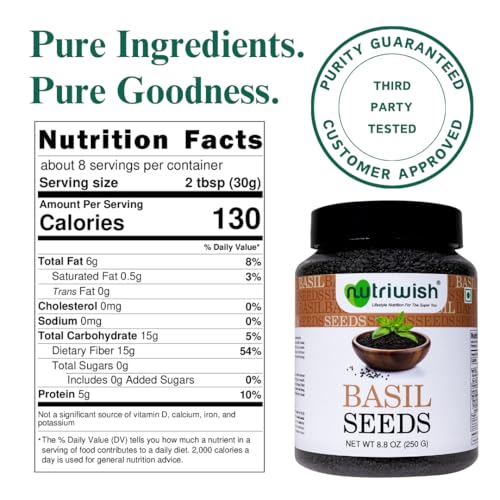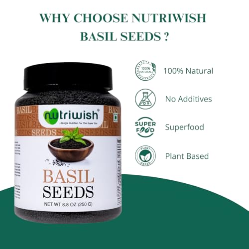 Discover Nutriwish Natural Basil Seeds also known as Holy Tulsi Seeds where nutritional excellence meets uncompromising quality. Sourced with meticulous care and transparency each pack ensures you receive the purest basil seeds rich in omega-3 fatty acids essential vitamins and minerals directly from trusted farms. Our seeds are rich in antioxidants supporting your immune system and overall well-being. Elevate your culinary creations by sprinkling these versatile dried basil seeds into salads blending them into refreshing coconut water smoothies or baking them into wholesome cookies. They add a delightful crunch and nutritional boost to any dish making them ideal for protein-rich snacks or omega-3 boosts. Whether you're following a keto gluten free or high protein food diet our basil seeds are a perfect fit offering versatility and health benefits in every serving. Join our thriving community today and embark on a journey of wellness with Nutriwish Basil Seeds enhancing your daily meals with pure fresh taste and essential nutrients. Harness the power of nature's goodness with Nutriwish Basil Seeds carefully processed to retain their natural properties and ensure optimal freshness. Whether you're seeking to boost your daily nutrient intake or simply enjoy a delicious wholesome snack our basil seeds deliver. Packed with fiber and essential nutrients they contribute to digestive health and satiety. Incorporate them into your favorite beverages like almond milk or add them to your morning oatmeal for a nutritious start to your day. The possibilities are endless with Nutriwish Basil Seeds supporting your wellness journey with every bite.