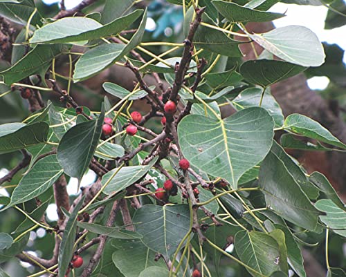 Ficus religiosa is a large dry season deciduous or semi evergreen tree up to 30 metres tall and with a trunk diameter of up to 3 metres . The leaves are cordate in shape with a distinctive extended drip tip; they are 10â17 cm long and 8â12 cm broad with a 6â10 cm petiole. Seeds are dispersed by various birds. The seeds can even germinate on other trees. If Peepal is growing on other tree it just rely on anchorage and does not take any nutrition from supporting tree. Pipal is not a parasitic tree. The nutrition is obtained from air deposited material and rain.Seeds are cooling refrigerant laxative and alterative. Botanical Name : Ficus Religiosa English Name : Sacred Fig Tamil Name : Arasam Palam Hindi Name : Aswattha Beej Malayalam Name : A rayal/pippalam Telugu Name : pippalamu