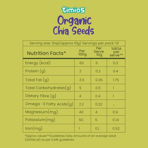 The tiny nutrition-packed superseeds are now a staple in many health-conscious households. Thanks to their small size mild taste and versatility it easy to incorporate chia seeds into your diet. The premium quality Timios chia seeds make a beneficial addition to your snacks and meals. Packed with essential nutrients including vitamins minerals and antioxidants chia seeds deliver a nutritional value that can support optimal health. Chia seeds contain soluble fiber that bring satiety prevents overeating and benefits the overall digestive system. Timios Chia Seeds are processed & produced as per USDA standards and certified by Jaivik Bharat. Experience the goodness of Timios Chia Seeds and embrace a healthier lifestyle. These nutrient-rich seeds are a natural choice for those seeking optimal nutrition balanced well-being and a delicious addition to their daily diet. A true superfood suitable for all ages from children to adults.