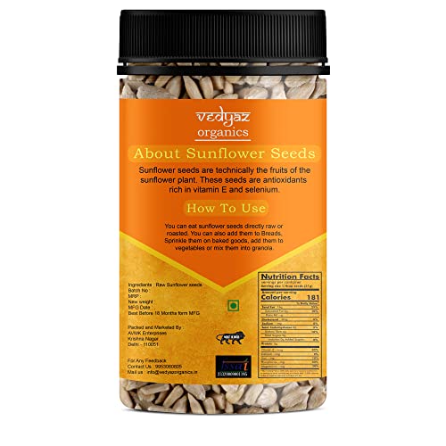 Vedyaz Organics Natural-Organic Sunflower Seeds are one of the healthiest superfood. They are loaded with VitaminsNutrients and Fibers that can provide a substantial amount of Energy and Healthy Fats.With their countless beneficial nutrients these seeds are useful to support your heart bones and beauty needs. Sunflower seeds can be easily incorporated into any food preparation to improve its nutritional quality and to provide a crunchy taste!. Incorporating these seeds in your diet improves heart health mentains body & beauty.