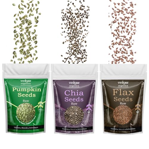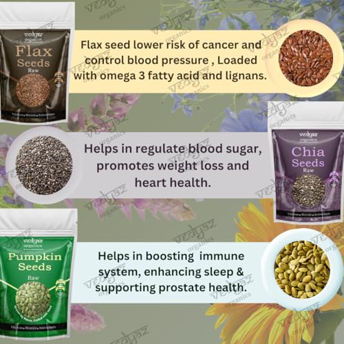 Veyaz Organics Healthy Edible Seeds Combo - 3 * 200 gm - 100% Natural Seeds/Immunity Booster/Rich In Omega 3 & Fatty Acids Pumpkin/Chia/Brown Flax/Mix Seeds for Eating/Healthy Seeds