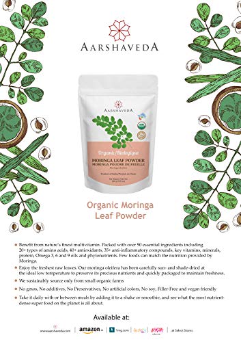 Aarshaveda Organic Moringa Oleifera Leaf Powder 200 Gm- 100% USDA Certified Natural Drumstick Powder, Sun And Shade Dried Packed With Over 90 Essential Ingredients, Free and Vegan Friendly
