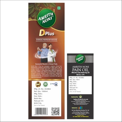 Unlock the benefits of natural health with the Amrith Noni D Plus & Pain Roll-On combo. Amrith Noni D Plus is infused with organic Noni fruit specifically designed to help manage blood sugar levels making it an ideal choice for individuals with diabetes. Complementing this is the Pain Roll-On which harnesses the power of Ayurvedic ingredients to deliver targeted relief from discomfort in the back joints knees and muscles. Together these formulations create a powerful synergy promoting overall wellness while addressing specific health concerns. Both products are made from high-quality natural ingredients. With the convenient applicator of the Pain Roll-On you can easily apply relief wherever needed making this duo an essential part of your daily routine.
