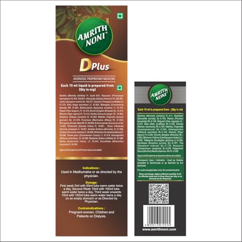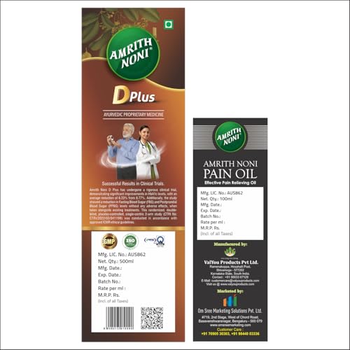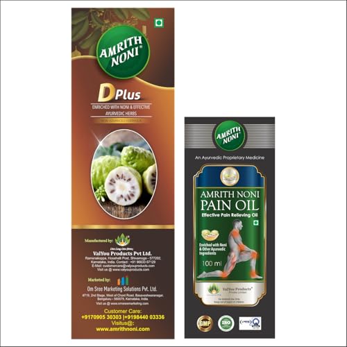 Unlock natural benefits with the Amrith Noni D Plus & Pain Roll-On combo. Amrith Noni D Plus is infused with organic Noni fruit specifically designed to help manage blood sugar levels making it an ideal choice for individuals with diabetes. Complementing this is the Pain Roll-On which harnesses the power of Ayurvedic ingredients to deliver targeted relief from discomfort in the back joints knees and muscles. Together these formulations create a powerful synergy promoting overall wellness while addressing specific health concerns. Both products are made from high-quality natural ingredients. Gently massage the affected area with 5-6 drops or the required amount of Amrith Noni Pain Oil. After half an hour give a hot pack with tolerably hot salt water making this duo an essential part of your daily routine.