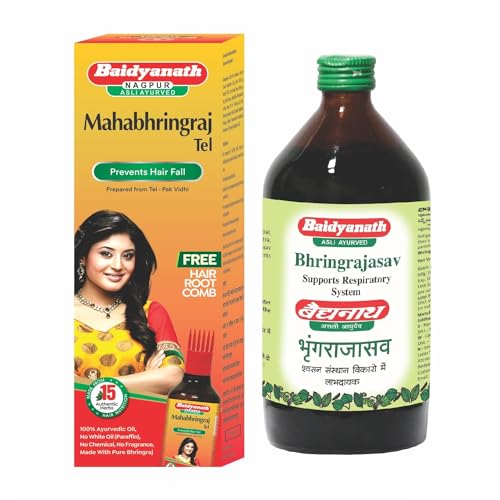 Baidyanath Mahabhringraj Tel - 200 mlMahabhringraj Tel is pure Ayurvedic chemical free nourishing hair oil made scientifically with goodness of Bhringraj an herb which is known in Ayurveda as ‘Keshraj- king of hair which helps your hair grow longer and healthier. The tail is prepared by Traditional Ayurvedic methods (Kshirpak vidhi) with a combination of 15 valuable clinically proven herbs dipped in pure Til tail (Sesame oil). This process with till tel as base oil will help to extract the entire medicinal qualities from the herbs giving us potent Mahabhringraj tel. Regular gentle massage of this therapeutic hair oil on the scalp will help control hair fall strengthen hair from their roots and is a helpful remedy for Dandruff. Its a 100 % Natural formulation free from mineral oils No silicone No synthetic colors and fragrances.Baidyanath Bhringrajasava 450 ml SyrupIt's a classical ayurvedic formulation