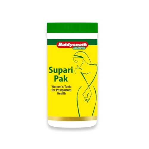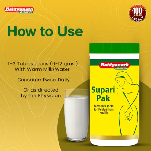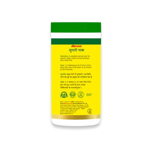 Baidyanath Supari Pak is a traditional Ayurvedic supplement for women's post-natal care. It helps support women's health and helps relieve headaches and backaches. It helps boost energy in women and supports uterus functioning. Mix 1-2 spoonfuls with equal quantities of water and consume it twice a day post meals or as directed by an Ayurvedic practitioner.