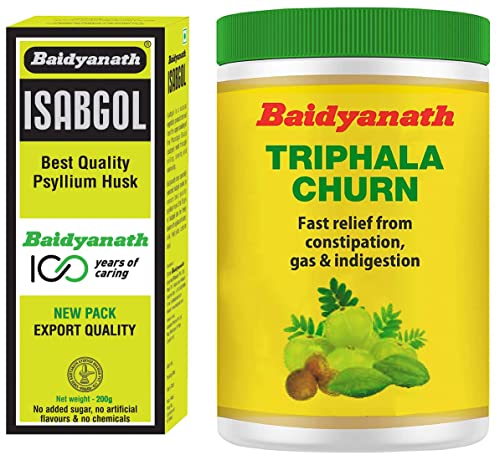 Baidyanath Triphala Churna | Helps Relieve Constipation |Quick Acidity & Gas Relief | Enriched with Amla - 240gms (Pack of 2)Triphala is a traditional Ayurvedic formulation made from 3 fruits - Amla Baheda and Haritaki. It is known as a herbal laxative that helps in quick relief from digestive distress like constipation acidity flatulence bloating and more. Baidyanath Triphala Churna uses the purest forms of Amla Baheda and Haritaki in this pack of Baidyanath Triphala Churna for complete digestive care. Mix 6-12 gm of Baidyanath Triphala Churna in a glass of hot water and consume daily on an empty stomach in the morning for best results.Baidyanath Vansaar Isabgol - Psyllium Husk Powder - 200gm | Effectively Relieves Constipation | Fibre Supplement For DigestionBaidyanath lsabgol (also known as Psyllium husk) is a natural vegetable product derived from the upper coating of Plantago Ovata seeds after through milling sieving and winnowing. Isabgol helps in maintaining a healthy digestive tract and relieves constipation and digestive distress. Baidyanath uses specially selected lsabgol seeds to ensure only the best quality psyllium husk is produced. It is a rich source of fibre and is gluten-free.