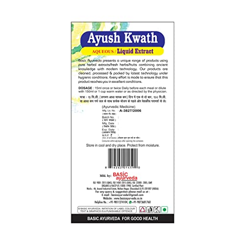• Basic Ayurveda Ayush Kwath liquid extract is an ayurvedic kadha that helps to boost immunity fight infections cough & colds throat irritation and improve respiratory functions.