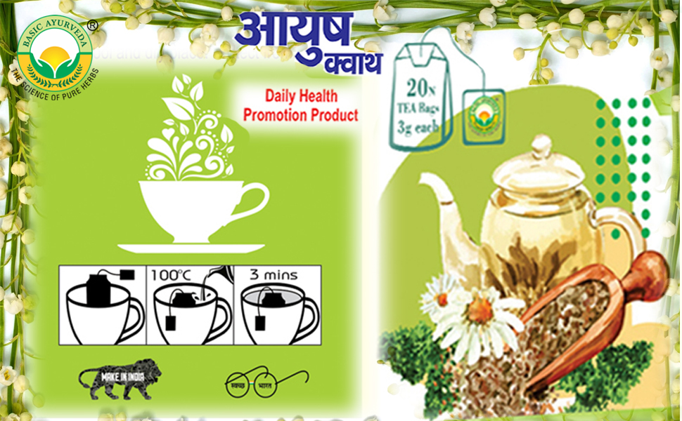 • Basic Ayurveda Ayush Kwath Infusion/Tea Bags is made up of ingredients that have a soothing effect on the throat and help protect the respiratory system from getting contaminated.