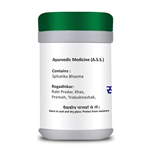 • Sphatika Bhasma (Shubhra Bhasma) contains a calcined form of Potash Alum ((Fitkari). Externally it is also indicated for skin problems female months' health and chronic loose motions.