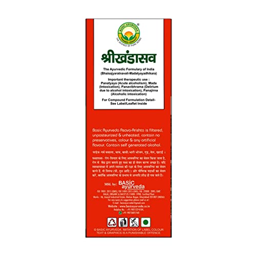 • Srikhandasava is a polyherbal Ayurvedic formulation in liquid form and contains self-generated alcohol. It is primarily used for severe reasons of alcoholism and its associated characteristics.