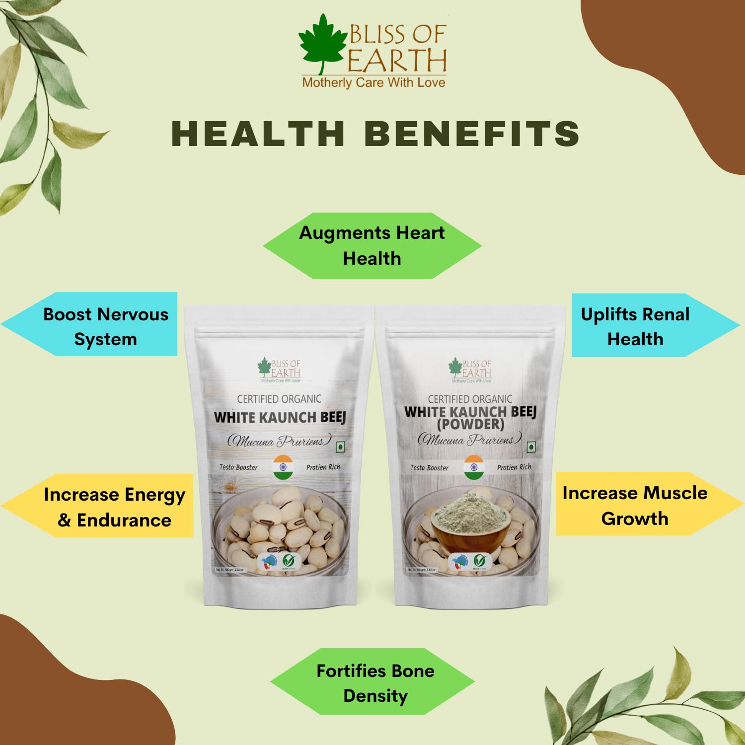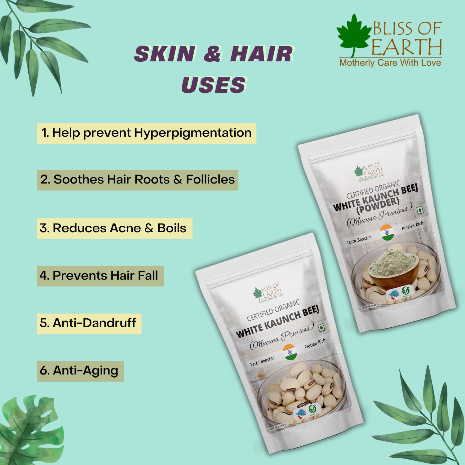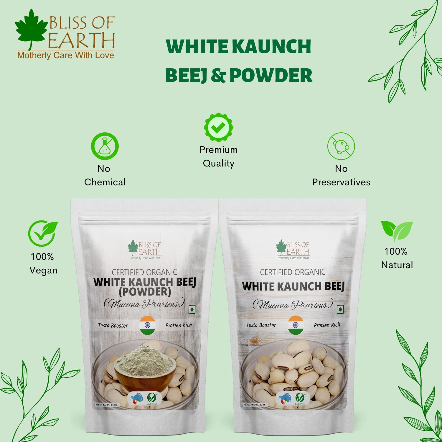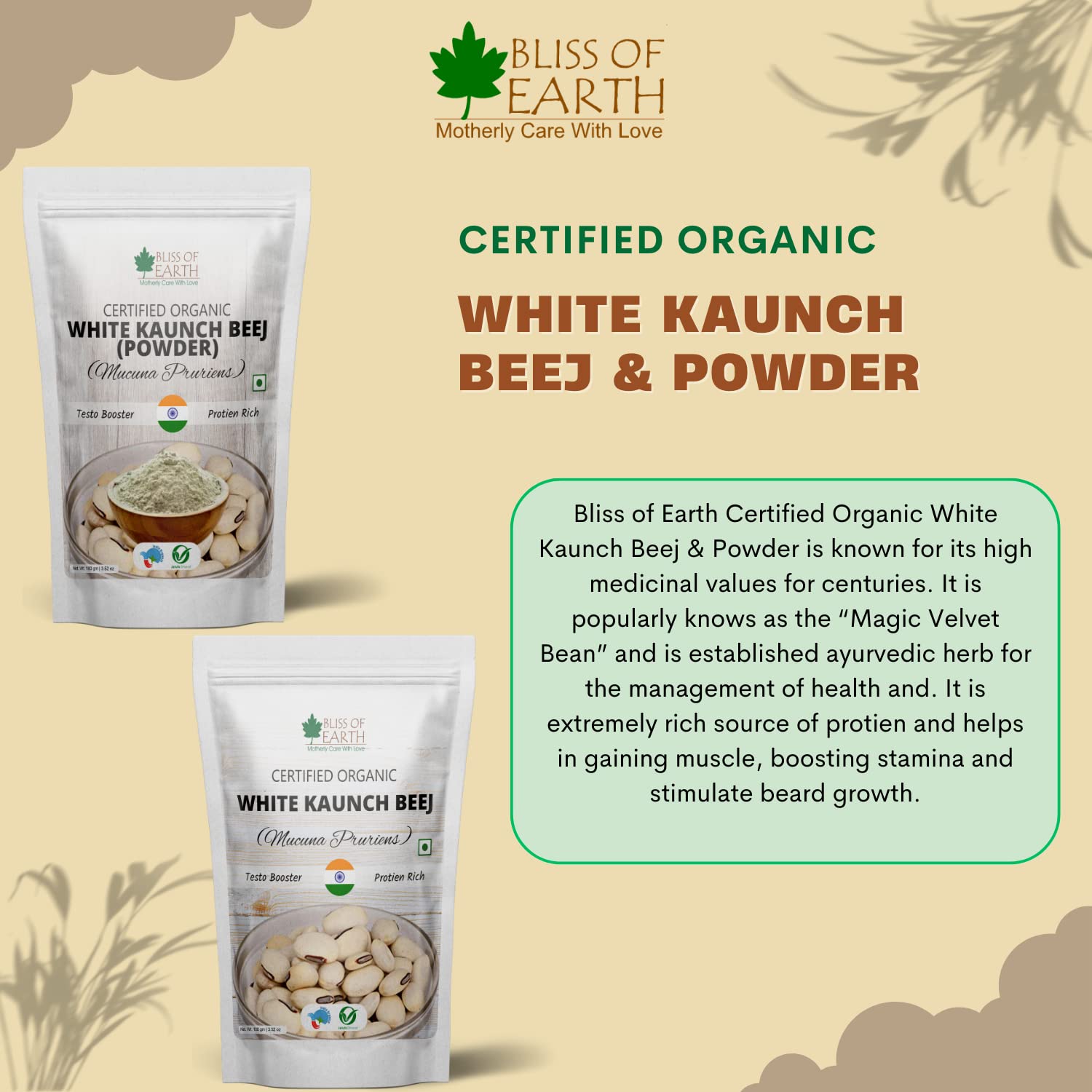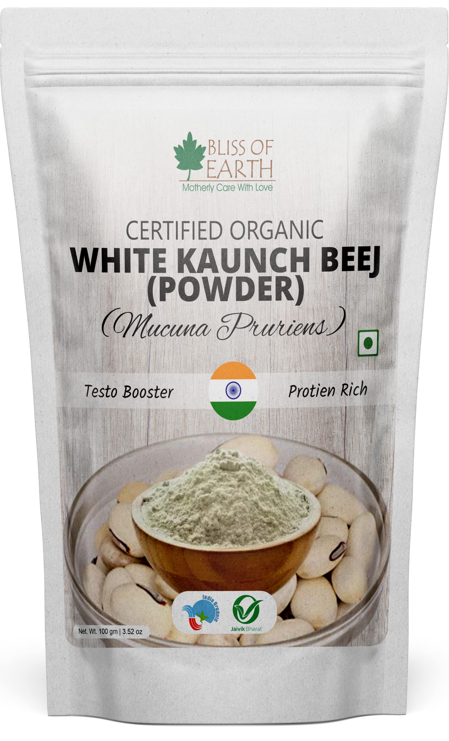 Bliss of Earth Certified Organic White Kaunch Beej Powder is known for its high medicinal values for centuries. It is popularly knows as the "Magic Velvet Bean" and is established ayurvedic herb for the management of health. It is extremely rich source of protien and helps in gaining muscle boosting and beard growth.
