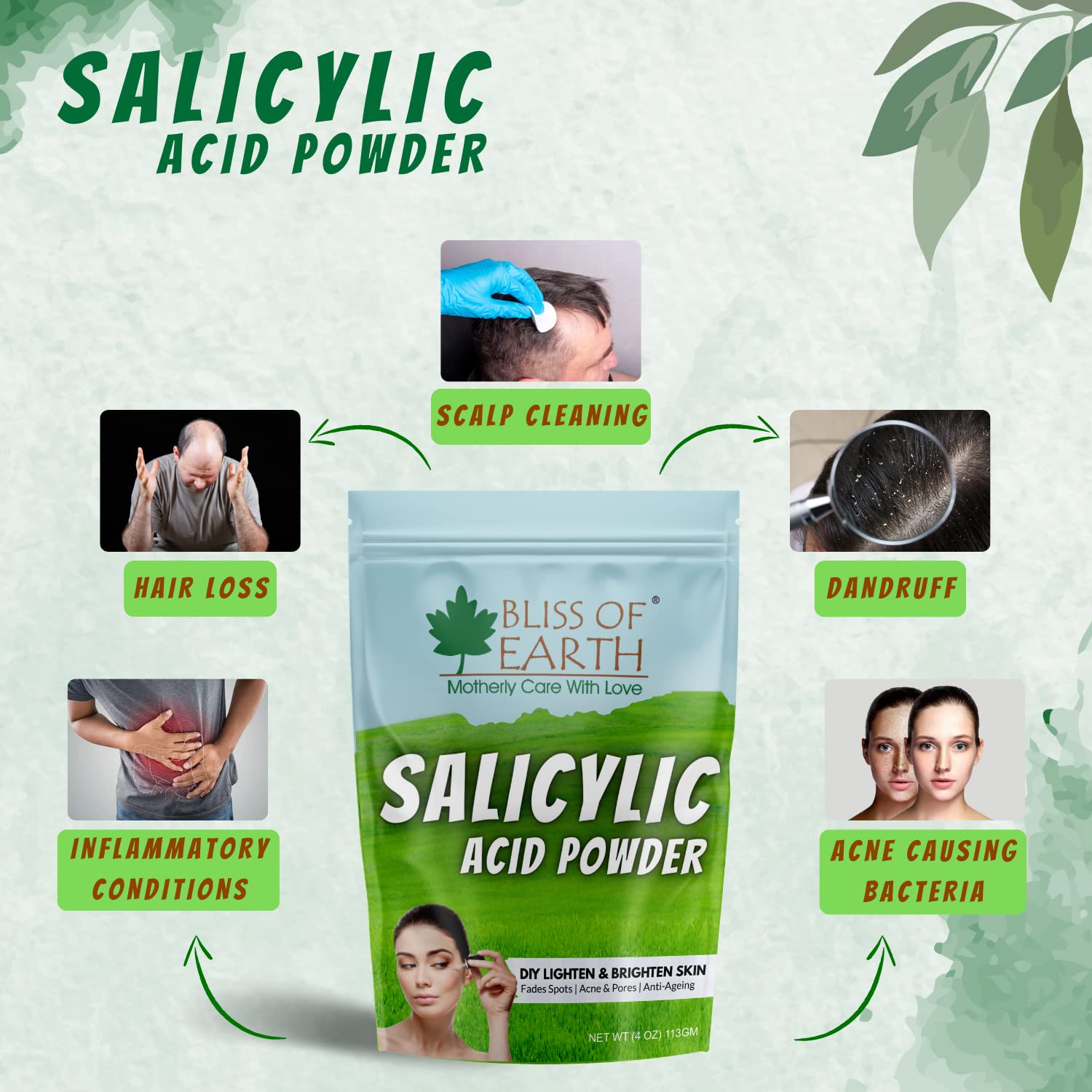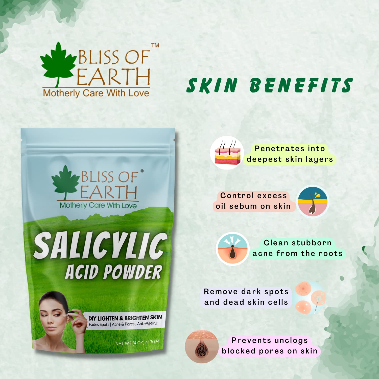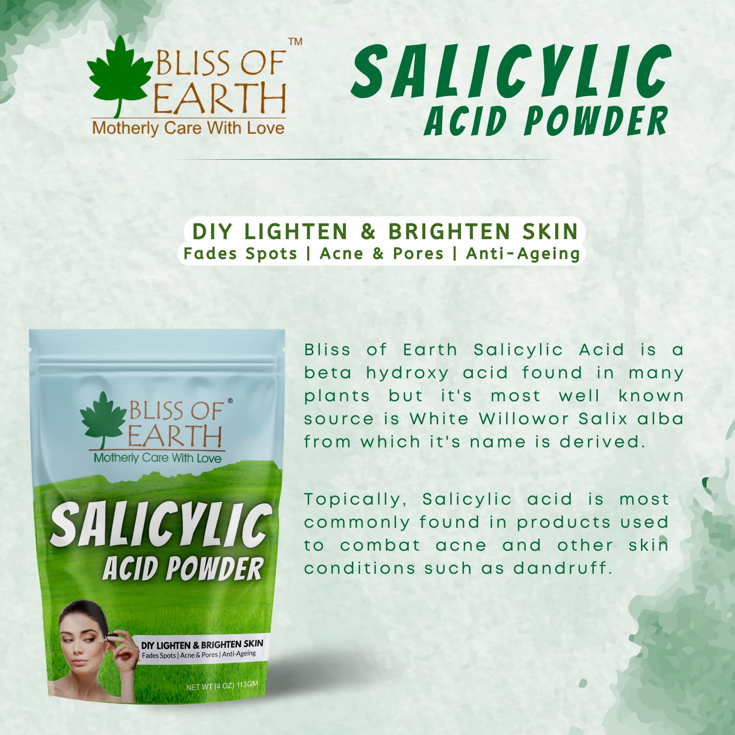 Bliss of Earth salicylic Acid is a beta hydroxy acid found in many plants but its most well know source is white willow or salix alba from which it's name is derived. Topically Salicylic acid is most commonly found in products used to combat acne and other skin conditions such as dandruff. It acts as a comdeolytic and bacteriostatic agent meaning it stimulates the shedding off dead skin cells unclogs pores and inhibits the growth of potentially acne-causing bacteria.