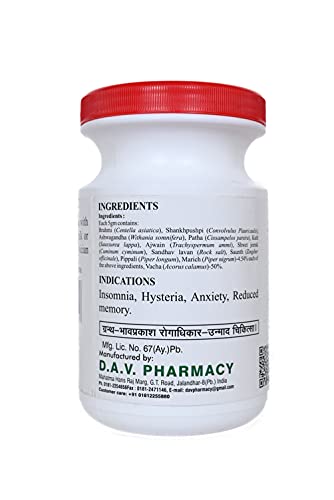 Each 5gms. contains: Brahmi (Centella asiatica) Shankhpushpi (Convolvulus Plauricaulis) Ashwagandha (Withania somnifera) Patha (Cissampelos pareira) Kuth (Saussurea lappa) Ajwain (Trachyspermum ammi) Shwet jeerak (Cuminum cyminum) Sandhav lavan (Rock salt) Saunth (Zingiber officinale) Pippali (Piper longum) Marich (Piper nigrum)-4.54% each of the above ingredients Vacha (Acorus calamus)-50%.
