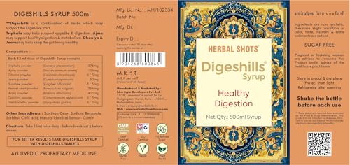 Herbal Hills Digeshills Herbal Shots 500ml Syrup for Healthy Digestion. Herbal Hills Ayurvedic Herbal Hills Digeshills Herbal Shots 500ml Take 15 ml twice daily - before breakfast & before dinner