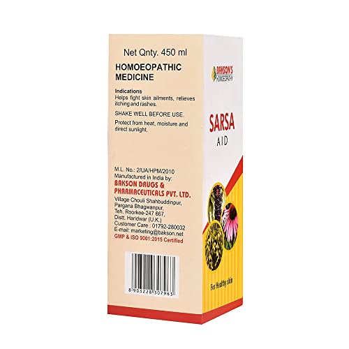 Embrace the beauty of healthy skin with Bakson's Sarsa Aid your natural solution for itching rashes and skin ailments. Crafted with potent homoeopathic remedies this syrup for itching & rashes detoxifies your blood from within offering a clear glowing complexion. Its healing properties soothe irritation reduce swelling and promote flawless skin. Don't settle for temporary relief; choose Bakson's Sarsa Aid for radiant spotless skin.