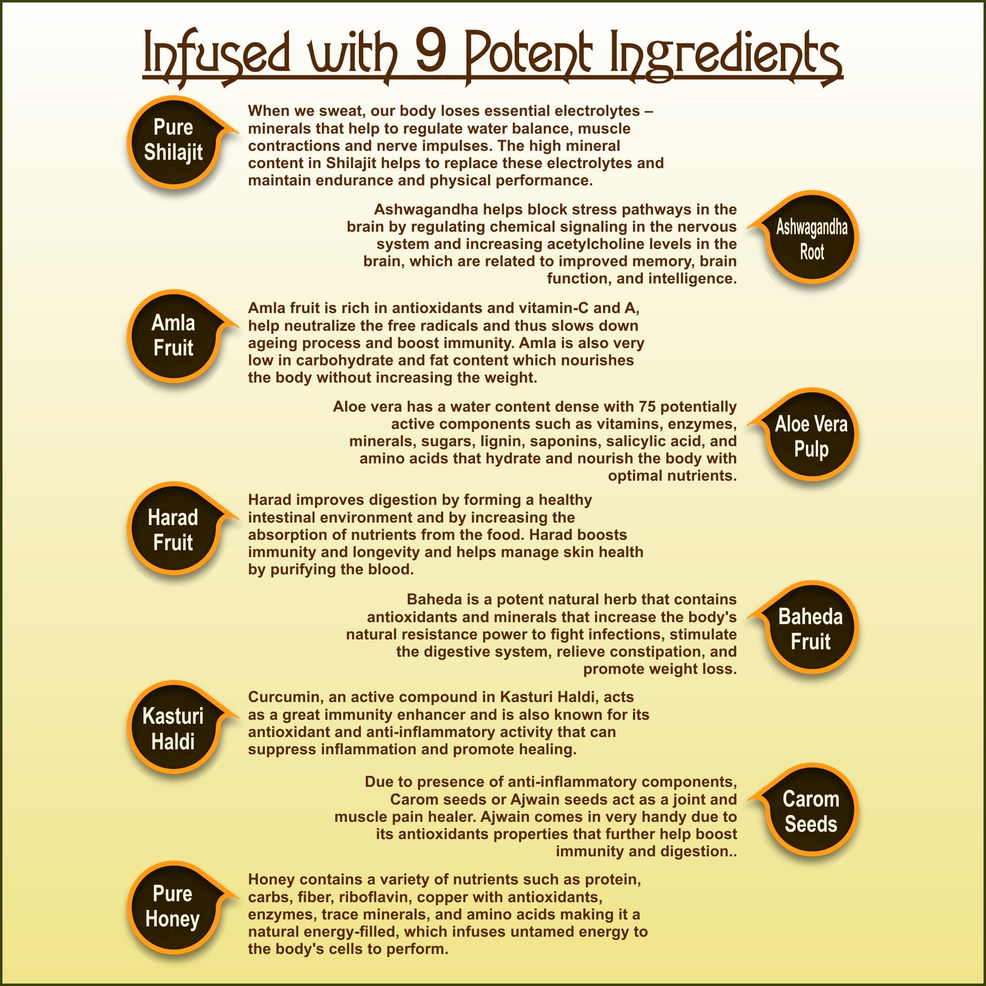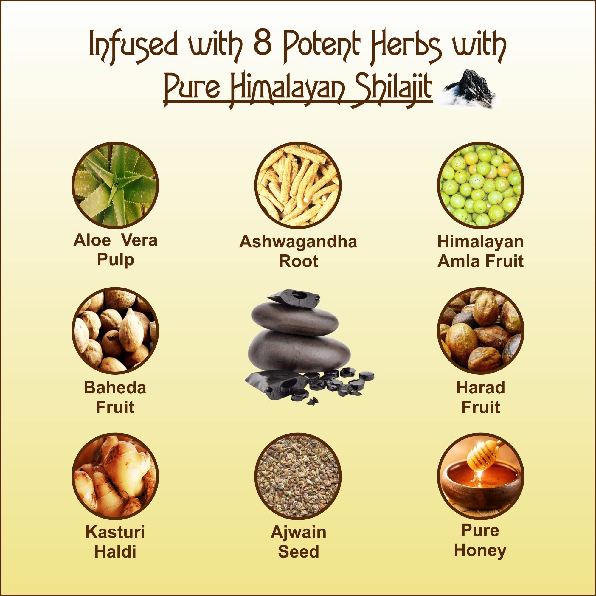 DESTROYER OF WEAKNESS : Shilajit Ras is a great source of Fulvic Acid and more than 84 minerals supplies untamed energy to body's cells maintains energy level & stamina in the body and counters physical & mental fatigue. In short Shilajit Ras is naturally