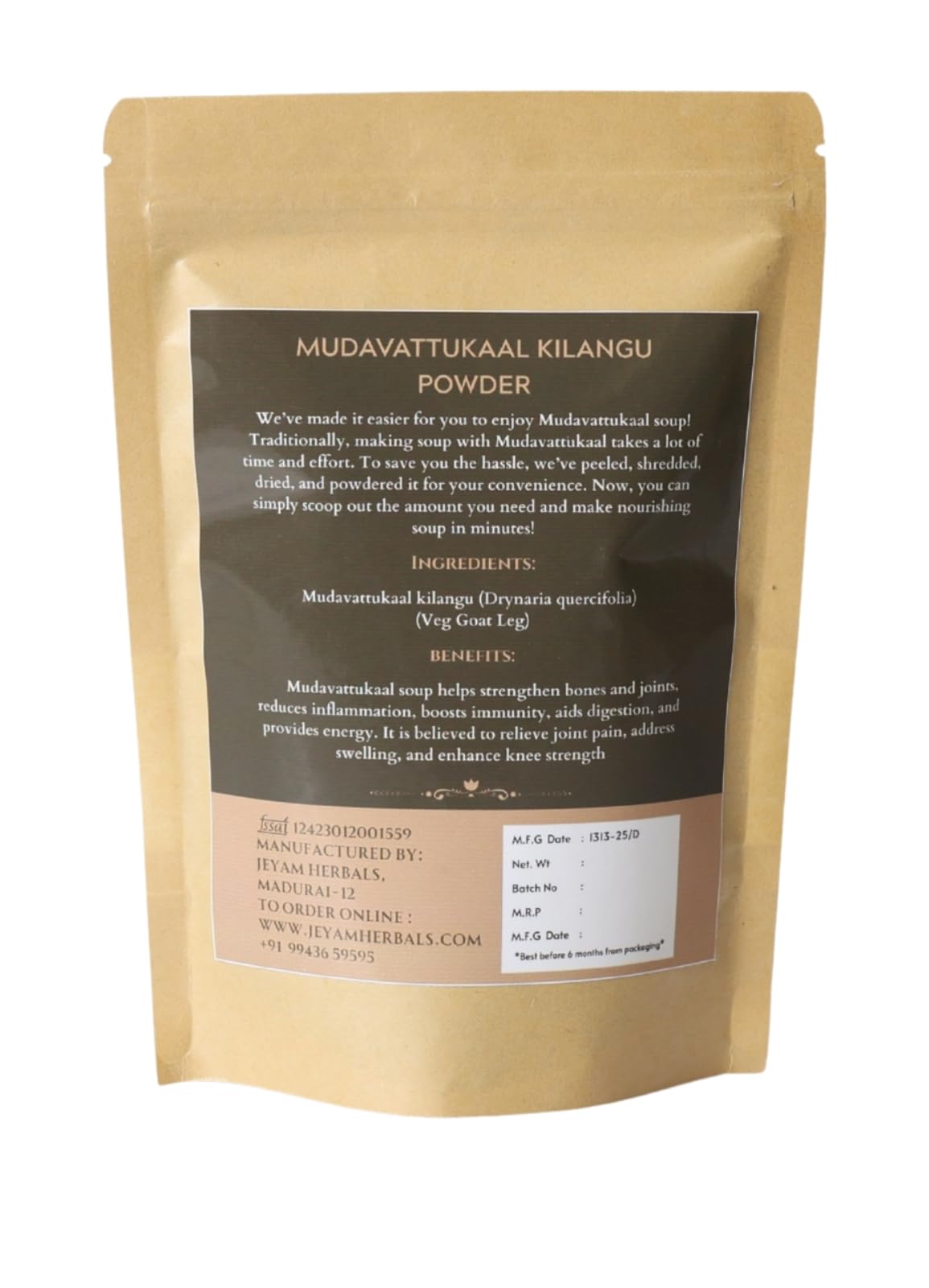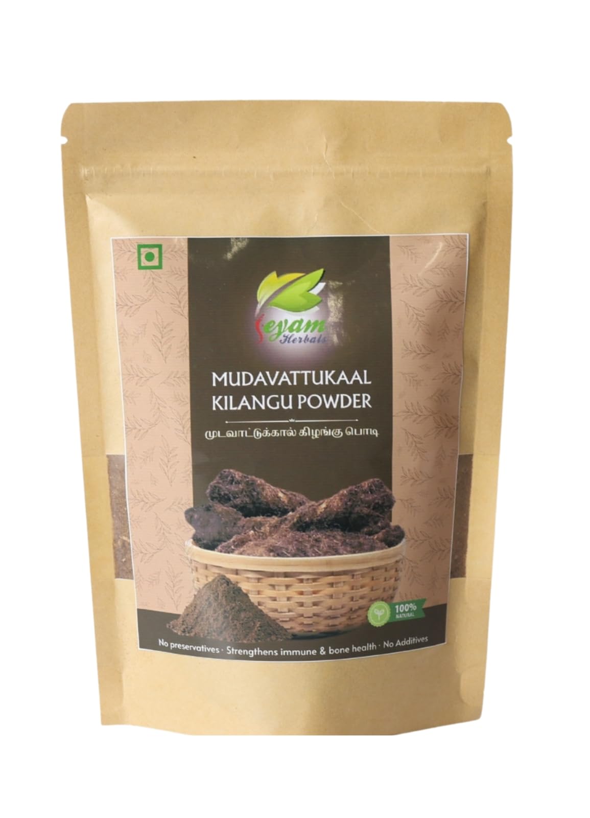 Jeyam Herbals Mudavatatukal Powder is a traditional herbal blend carefully prepared using a variety of naturally dried roots leaves and spices known in native wellness practices. Formulated with time-tested ingredients this powder is valued for its natural warming properties and is often used as part of a balanced lifestyle. Crafted to support daily nourishment the powder includes ingredients such as dry ginger pepper long pepper cumin coriander seeds and other native herbs. These herbs are known to be traditionally used to promote internal balance and provide gentle warmth to the body. This multipurpose powder can be used to prepare soups or decoctions making it a versatile addition to your kitchen. Simply mix with water and boil for a few minutes then strain and enjoy warm. It can be consumed regularly especially during weather changes or as part of your herbal routine. Free from artificial colors preservatives and synthetic additives this blend is made with pure sun-dried herbs and spices to retain their natural aroma and potency.