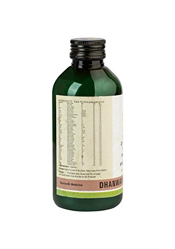 Ingredients: Dhanwantharam kwath (qty./15 Ml) bala (sida cordifolia) - 26 g yava (hordeum vulgare) - 1. 15 G kola (zizhyphus jujuba) - 1. 15 G kulattha (dolichos biflorus) - 1. 15 G bilva (gmelina arborea) - 1. 15 G syonaka (oroxylum indicum) - 1. 15 G gambhari (gmelina arborea) - 1. 15 G patala (stereospermum suvaeolens) - 1. 15 G agnimantha (premna integrifolia) - 1. 15 G salaparni (desmodium gangeticum) - 1. 15 G prasniparni (uraria picta) - 1. 15 G brahati (solanum indicum) - 1. 15 G kantakari (solanum xanthocarpum) - 1. 15 G goksura (tribulus terrestris) - 1. 15 G asvagandha (withania somnifera) - 1. 15 G ksiravidari (ipomea paniculata) - 1. 15 G satavari (asparagus racemosa) - 1. 15 G meda (polygonatum cirrhifolium) - 0. 12 G mahameda (polygonatum cirrhifolium) - 0. 12 G devadaru (cedrus deodara) - 0. 12 G manjistha (rubia cordifolia) - 0. 12 G kakoli (lilium polyphyllum) - 0. 12 G ksirakakoli (fritileria roylei) - 0. 12 G chandana (santalum album) - 0. 12 G sveta sariva (hemidesmis indicus) - 0. 12 G kushta (saussurea lappa) - 0. 12 G tagara (valeriana wallichi) - 0. 12 G methi (trigonella foenum graecum) - 0. 12 G jeevaka (microstylis nucifera) - 0. 12 G saindava lavana (rock salt) - 0. 12 G saileya (black silajit) - 0. 12 G vacha (acorus calamus) - 0. 12 G agaru (aquilaria agallocha) - 0. 12 G rakta punarnava (boerhaavia diffusa) - 0. 12 G yashtimadhu (glycyrhiza glabra) - 0. 12 G haritaki (terminalia chebula) - 0. 12 G bibhitaka (terminalia belerica) - 0. 12 G amalaki (emblica officinalis) - 0. 12 G satahua (peucedanum graveolens) - 0. 12 G masaparni (teramnus labialis) - 0. 12 G mudgaparni (vigna trilobata) - 0. 12 G ela (elettaria cardamomum) - 0. 12 G tvak (cinnamomum zeylanicum) - 0. 12 G tejpatra (cinnamomum tamala) - 0. 12 G.