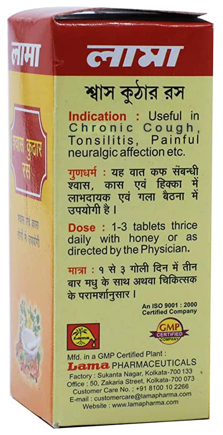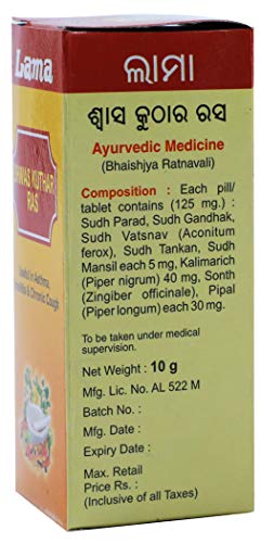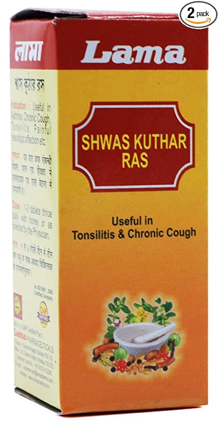 Lama Shwas Kuthar Ras a classical Ayurvedic product from Lama Pharmaceuticals a trusted name in Ayurveda since 1982. Ingredients are: Piper Nigrum Piper Longum Zingiber Officinale Purified Sulphur Powder etc.