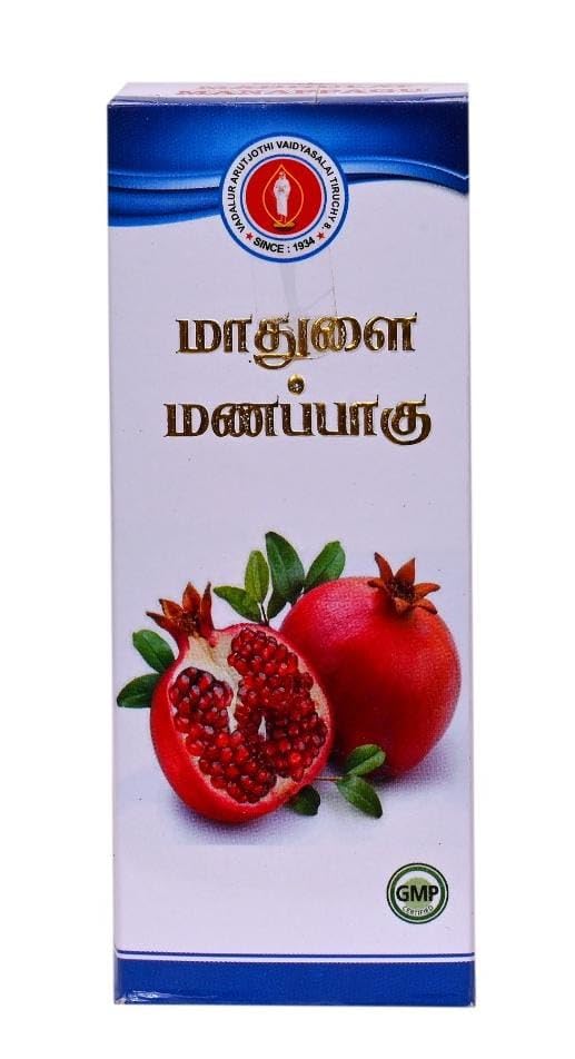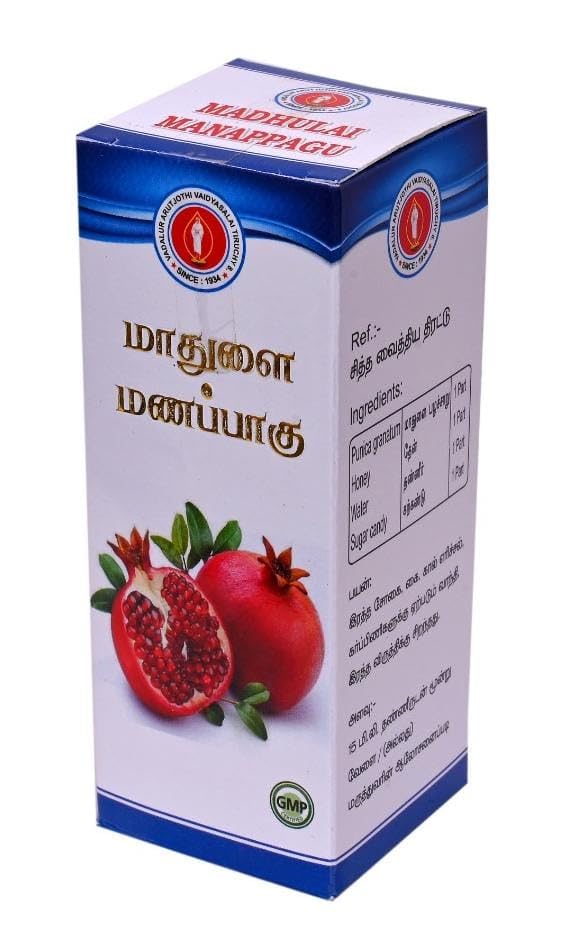 Madhulai Manapagu has Madhulai Manappagu is a classical Siddha medicine. It is a herbal syrup with pomegranate as the prime ingredient.Pomegranate is known for its richness of antioxidants vitamin A C and E along with the minerals iron and calcium. Madhulai manapagu is a herbal formulation that is widely used for healing anaemia which is generally caused by iron deficiency. This syrup has a sweet odour and pleasant taste and contains pomegranate juice as the main component. The syrup usually does not contain any artificial color or flavorings. many benefits when consumed on a regular basis. They are: It quenches thirst and boosts energy: The syrup contains pomegranate juice along with multiple herbs that helps in revitalizing the body that in turn boosts up the energy in the body. Heart health: It has cardio-tonic properties that aid in maintaining the strength of the heart by improving the contraction of the heart muscle leading to efficient pumping of the blood. Nutrition: Madhulai Manapagu contains many essential nutrients. The seeds of the pomegranate purify the blood and have a cooling effect on the body. Anti-oxidants: The Madhulai Manapagu has many antioxidants owing to the pomegranate juice herbs and honey used to make it. Vitamin C: It is rich in Vitamin C which is known to be an immunity builder Dosage: 10 to 15ml with water twice in a day after food