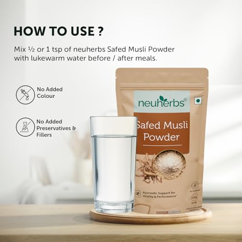 Neuherbs brings to you the goodness of natural pure & organic Safed Musli Powder for complete body vitality & performance. This Ayurvedic Safed musli powder is made from natural safed musli root bringing you all the known vital functions of safed musli. Safed musli powder benefits you by enhancing the vitality of your body it also helps increase stamina energy & body strength. With this magical Ayurvedic herb acts as a natural performance booster that helps reduce physical weakness & boost the performance . neuherbs Organic Safed Musli Powder does not contain added preservatives artificial colour or flavour to give you authentic safed musli powder benefits.