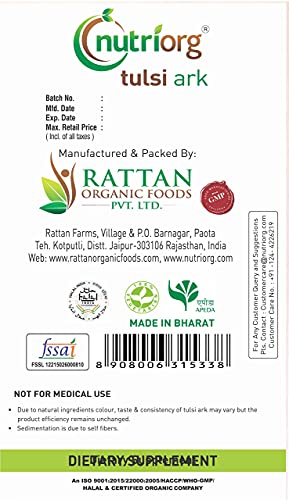 • Nutriorg Tulsi Ark is made from 5 types of Tulsi namely Rama Tulsi Shama Tulsi Shwet Tulsi Vana Tulsi And Krishna Tulsi mixed in a very effective proportion.
