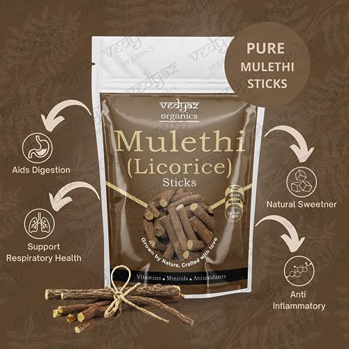 Introducing Vedyaz Organics' Mulethi Sticks: a remarkable product that brings together the essence of nature's sweetness and wellness in one eco-friendly package. Handpicked and sourced from certified organic farms our Mulethi Sticks embody purity and authenticity ensuring you receive the best of what nature has to offer. Experience the natural sweetness of Mulethi also known as Licorice root and bid farewell to processed sugars. With its myriad of health benefits these sticks are a perfect addition to your daily routine supporting digestion and boosting your immune system with their natural antioxidants. Whether you add them to your favorite hot beverage sweeten desserts or explore their unique flavor in savory dishes the possibilities are endless. Embrace the convenience of Mulethi Sticks effortlessly enhancing your well-being and culinary experiences. At Vedyaz Organics we are passionate about offering products that honor nature's gifts and our Mulethi Sticks stand as a testament to our commitment to quality authenticity and your satisfaction. Rediscover the wonders of nature and elevate your health with Vedyaz Organics' Mulethi Sticks today.