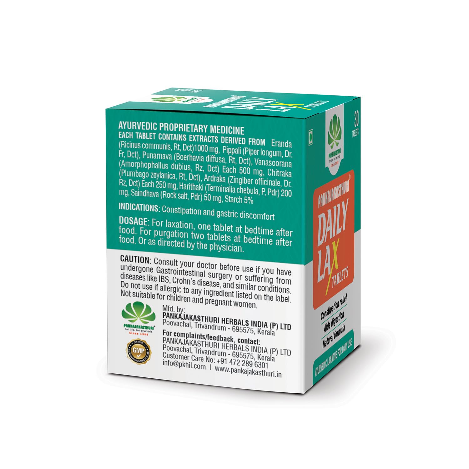 Daily Lax by Pankajakasthuri offers a gentle natural solution for digestive wellness through traditional Ayurvedic wisdom. This carefully formulated blend of eight potent herbs including Eranda Pippali Punarnava and Vanasoorana works harmoniously to support healthy bowel movements and digestive function. The tablets are designed to work overnight without disturbing your rest making them suitable for regular use. Beyond addressing constipation this formulation helps maintain overall digestive health by supporting natural cleansing and detoxification of the digestive tract. It aids in reducing digestive discomfort and bloating while promoting smooth bowel movements. Each tablet harnesses the power of time-tested Ayurvedic ingredients to help maintain digestive balance and comfort. The convenient 30-tablet pack makes it easy to incorporate into your daily wellness routine. As with any supplement it's advisable to follow the recommended dosage for optimal results.