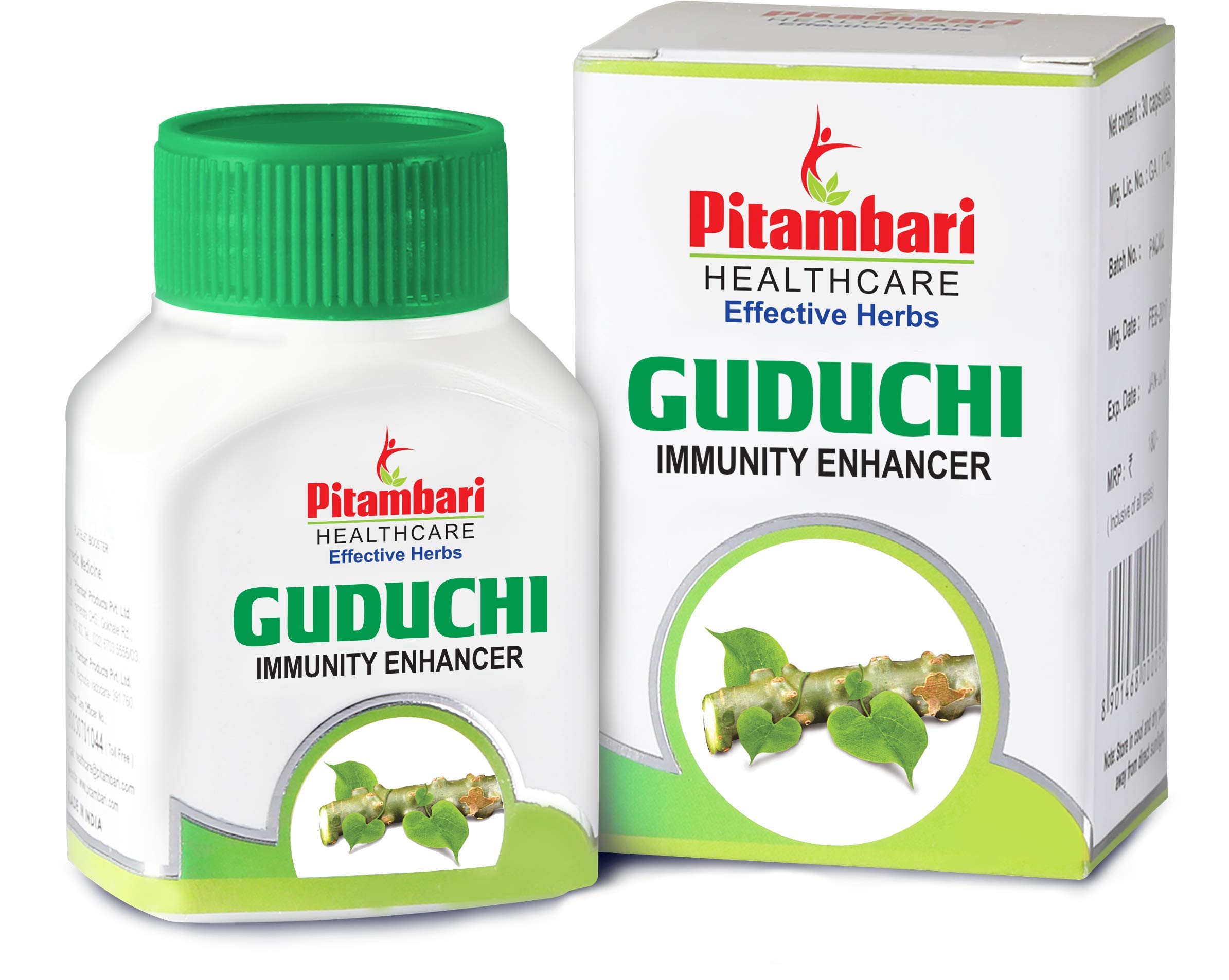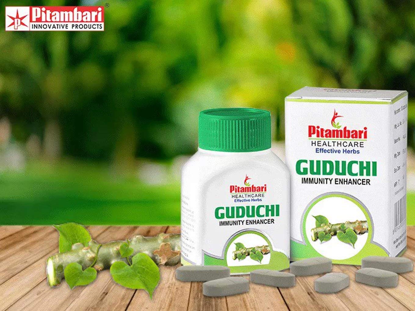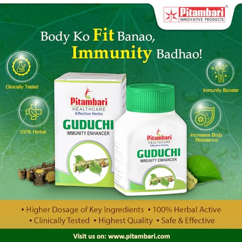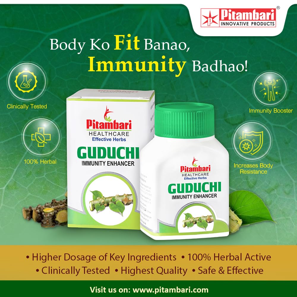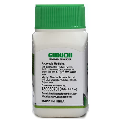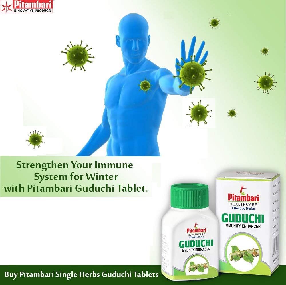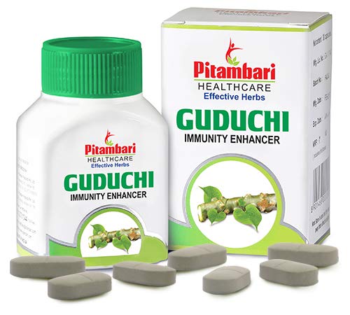PITAMBARI GUDUCHI TABLETS helps in treating an array of disease conditions ability to destroy toxins and have a nourishing action on the body. Guduchi also supports in reduction of the three doshas vata pitta and kapha.PROPERTIES : Excellent immunity booster Helps to Increases body resistance to illness stress & anxiety Fights Against recurrent infection Being adaptogenic helpful in early recovery from illnessCOMPOSITION : Guduchi (T. cordifolia) stem Extract - 400 mg DOSAGE & RECOMMENDATIONS : 1 to 2 tables two times a day after foodPRECAUTION : To be taken cautiously in pregnancy & lactating motherWHY PITAMBARI'S GUDUCHI TABLETS Higher Dosage of Key ingredients 100 % Herbal Active Clinically tested Highest Quality Safe & Effective