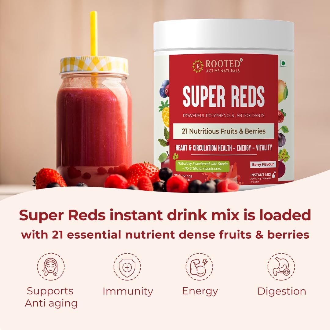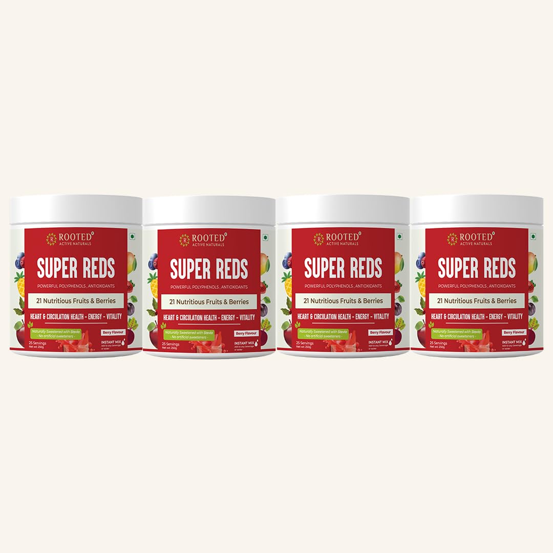 Rooted Actives Super Reds Powder (Pack of 4 250g each) is made from a carefully selected fruit and berry blend including grapes raspberries beetroot strawberries and pomegranate. This powder has no added sugar and contains no artificial flavors sweeteners or preservatives. Designed for easy mixing this berry-flavored formula blends well with water smoothies or juices. It is vegan non-GMO and gluten-free making it a suitable choice for various dietary needs. The pack of 4 offers long-term value.