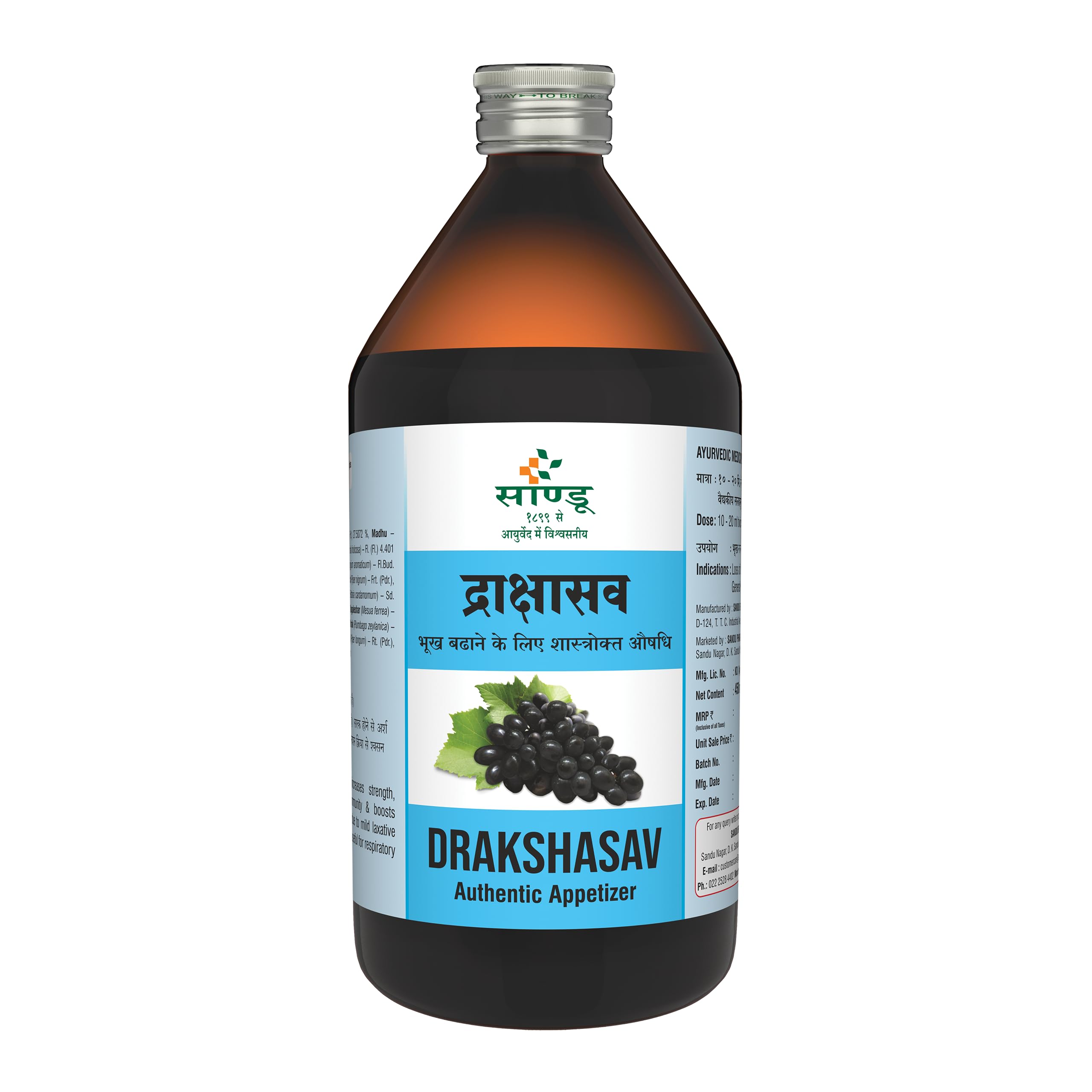Benefits: Sandu Drakshasav stimulates appetite and improves digestion by increasing digestive secretions. It rejuvinates mood and thus is helpful in loss of appetite. It eliminates vitiated pitta and relieves bloating and constipation. It is beneficial in