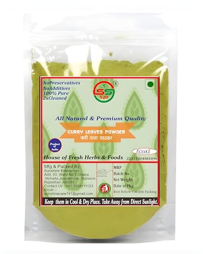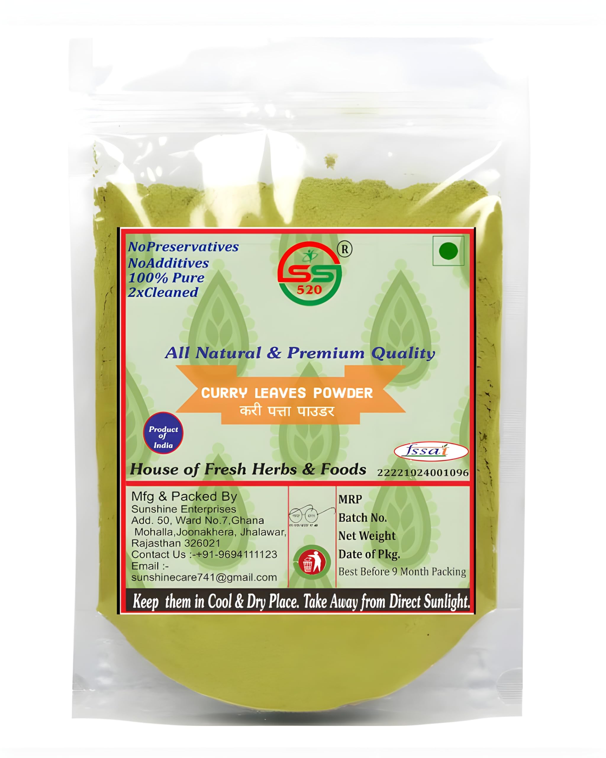 Premium Curry Leaves Powder an exceptional natural solution for enhancing not just your culinary creations but also your overall well-being. Sourced from the finest organic curry leaves this pack is meticulously crafted to bring you the wholesome goodness and benefits of this incredible plant.SS520 Curry Leaves Powder is carefully processed to retain its inherent nutritional properties making it a versatile addition to your daily routine. With its rich antioxidant content this powder not only enriches the flavor of your dishes but also serves as a potent ingredient for various health and beauty purposes. Nutrient-Rich Packed with essential vitamins and minerals SS520 Curry Leaves Powder is a powerhouse of nutrients vital for maintaining a healthy body and radiant skin. (1.) Culinary Marvel Enhance the taste and aroma of your dishes with this aromatic powder infusing your culinary creations with the distinct essence of fresh curry leaves. (2.) Beauty Secret Experience the transformative effects on your skin with regular consumption as SS520 Curry Leaves Powder in promoting an even skin tone reducing the appearance of pimples and dark circles and contributing to a natural glow. Holistic Hair Care Nourish your hair naturally with the goodness of curry leaves as SS520 powder stimulates hair growth strengthens roots and contributes to maintaining a lustrous mane. Skin Glowing Revel in the natural skin-glowing properties of this powder harnessing the power of nature to achieve a brighter and more glowing skin tone.