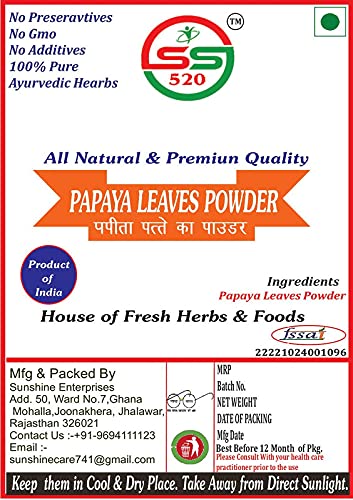Papaya Leaf Powder :- The papaya is a tropical fruit high in vitamins C and A as well as fiber and healthy plant compounds. It also contains an enzyme called Papain. Papaya has powerful antioxidant effects which may reduce oxidative stress and lower your risk of several diseases. Papaya's high vitamin C and lycopene content can improve heart health and may reduce your risk of heart disease. The powerful antioxidants in papaya can help your skin recover from sun damage and may defend against wrinkling.