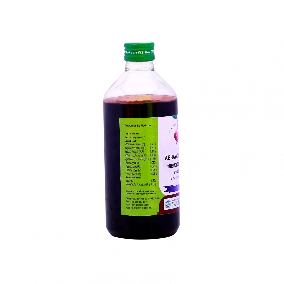 Vaidyaratnam AbhayarishtamVaidyaratnam Abhayarishtam or Abhayarishta is an Ayurvedic product for natural wellness. This herbal decoction is traditionally used for mild to moderate constipation.Form: LiquidType: DigestiveIdeal for: AdultsGender: Both men and womenPackage content: 450ml in an airtight plastic bottleIngredientsVaidyaratnam Abhayarishtam is enriched with herbal goodness. This digestive tonic is made withGur- JaggerySonth- GingerChavya- CubebNishoth- TurpethMadhuka- HoneyMunakka- RaisinsDhania- CorianderSaunf- Fennel seedsIndravaruni- ColocynthMochrus- Bombax ceibaGokshura- Puncture vineDhataki- Fire flame bushHaritaki- Black myrobalanDantimool- Red physic nutVaividang- False black pepperBenefitsVaidyaratnam Abhayarishtam may be useful in helping stomach disorders. Users may get some relief fromGasDysuriaBloatingFlatulenceIndigestionAnal fissuresLoss of appetiteAbdominal distensionHard stool caused due to pilesMay ensure proper bowel movementMay balance Vata, Kapha and Pitta doshaVaidyaratnam Abhayarishtam comes with the following properties.LaxativeAppetitizerCarminativeMild diureticAnti-haemorrhoidDigestive stimulantFeaturesVaidyaratnam Oushadhasala was founded to offer high quality and authentic herbal products to the customers. It is located at Ollur, Kerala. Vaidyaratnam AbhayarishtamIs 100% herbalIs mild in natureIs made with the best quality ingredientsIs not known to have any adverse effects on the userComes with a long shelf life of 24 months from the date of manufactureDoseVaidyaratnam Abhayarishtam should be consumed after consulting an Ayurvedic physician. Generally the below steps are followed to have the decoction.Take the tonic twice a dayHave the supplement on regular basisAdults may have 15-30ml of the tonic per dayChildren may have 0.5ml per kg of body weightShould be consumed for 2-4 weeks for effective resultsFiber rich diet should be taken along with this medicationTipsVaidyaratnam Abhayarishtam stays fresh and edible for long if the below tips are followed.Store at a cool and dry placeWarningKeep away from childrenDo not expose to direct sunlightDo not exceed the recommended doseLegal Disclaimer: Statements regarding dietary supplements ha