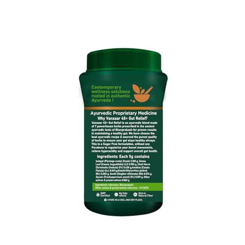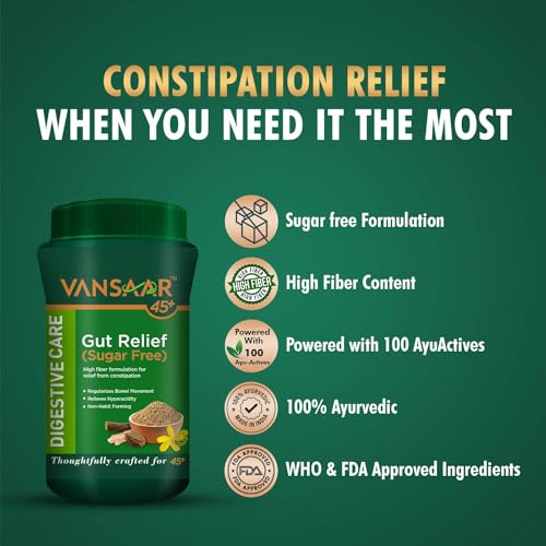 Vansaar Gut Relief is a high fiber ayurvedic digestion supplement for fast (overnight) and effective relief from constipation as it acts as a natural stool softener and helps get natural relief from hard stool constipation. Gut Relief powder helps in regularizing bowel movement and brings relief from hyperacidity indigestion abdominal bloating and gas. It is a sugar-free ayurvedic non-habit forming formulation made with Isabgol Senna leaves Ajwain Choti Harre Amaltas Mulethi & Sonth.