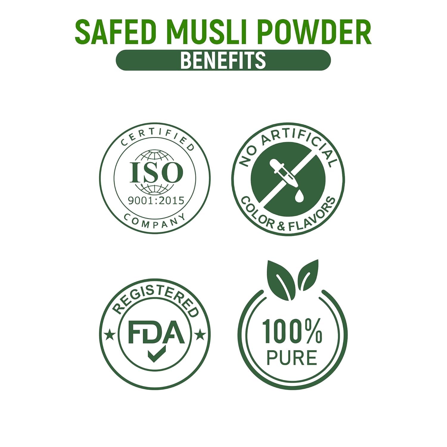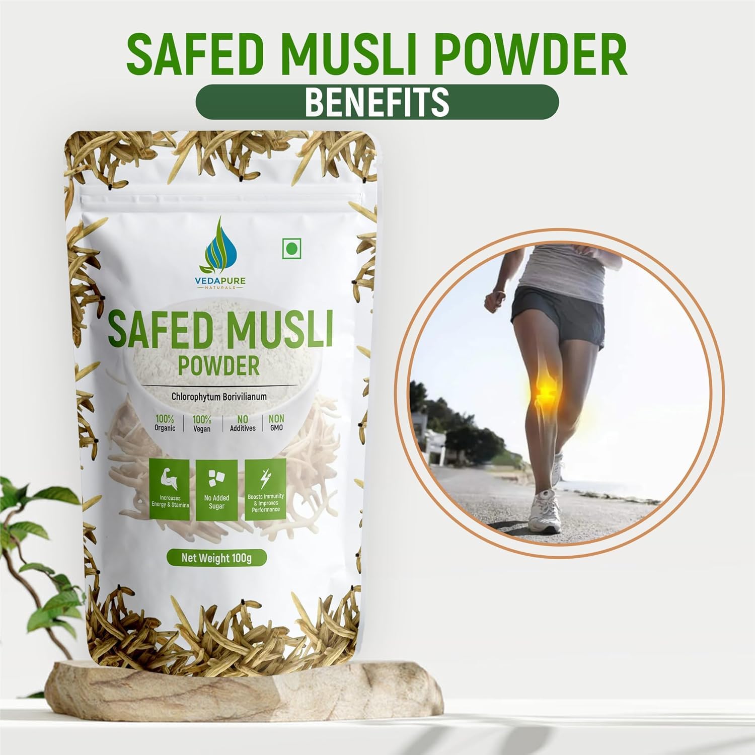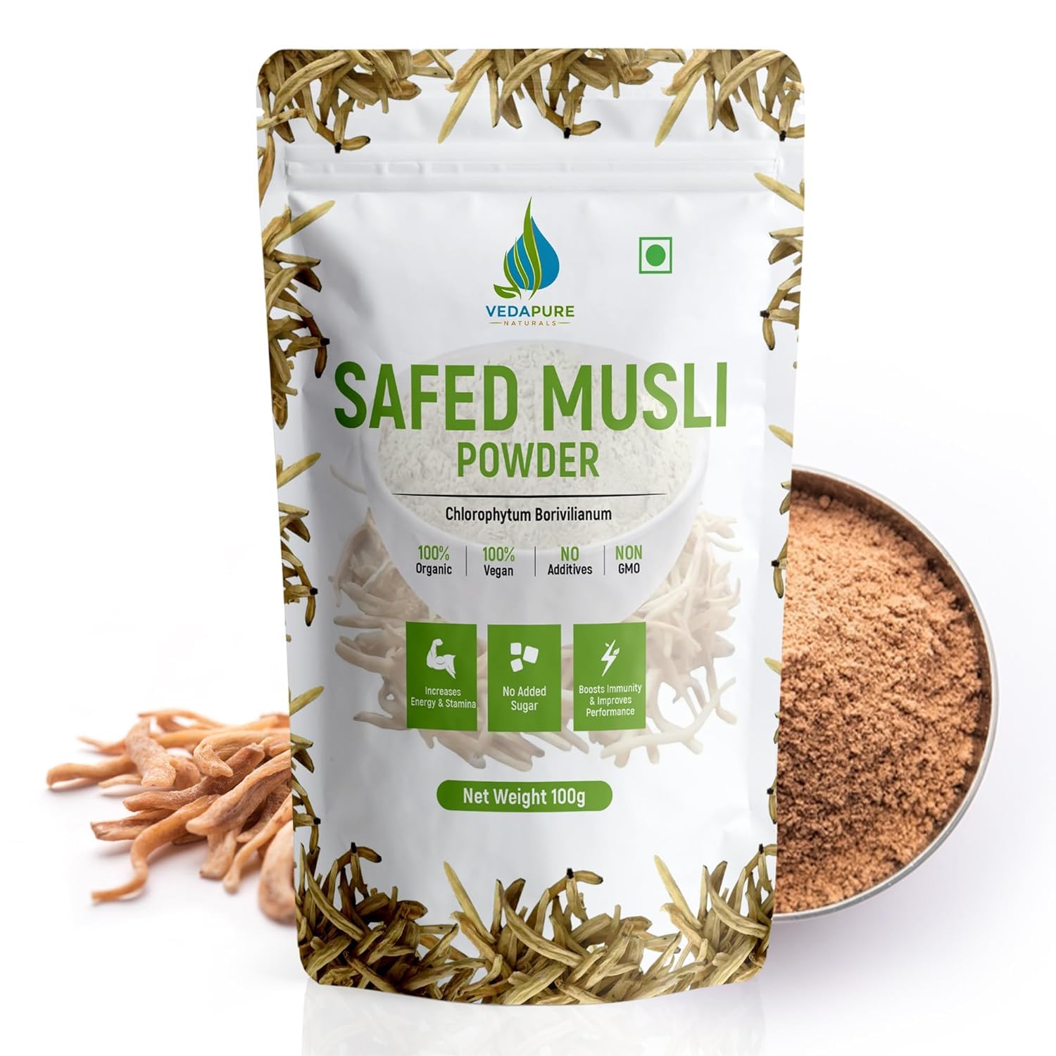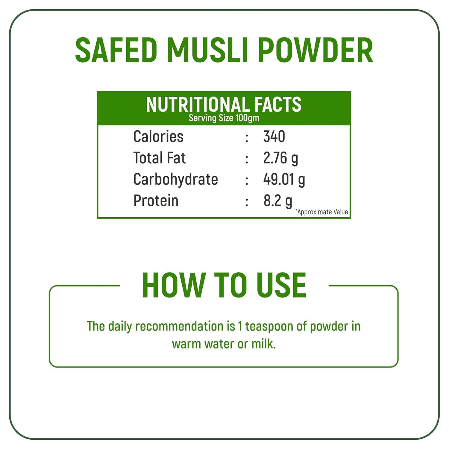 • How to Use: Mix 1 teaspoon of Vedapure Safed Musli Powder into warm water or milk and consume daily. This Ayurvedic formula is made with natural ingredients and is safe for regular use.