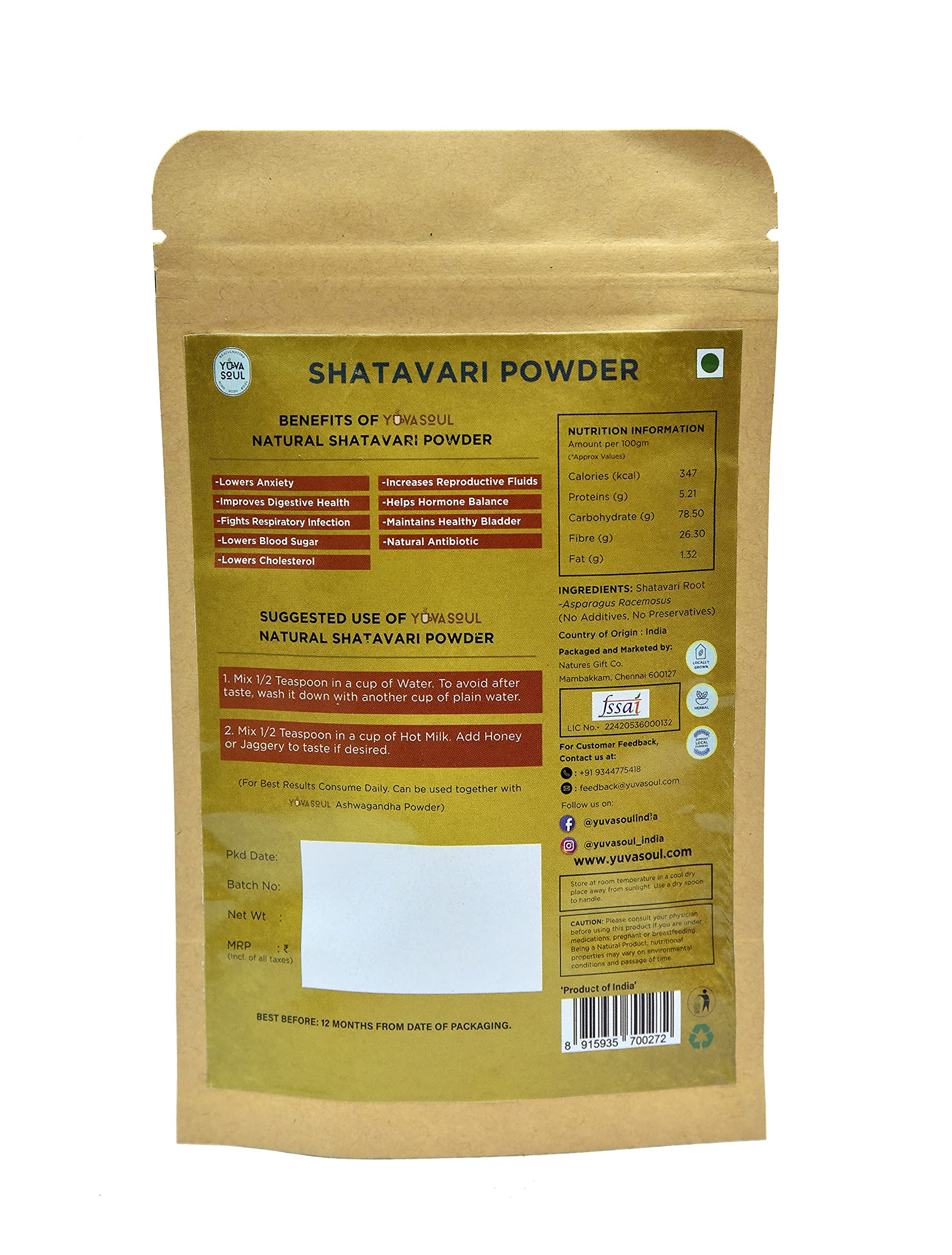 Package Content: 60 Gm of Ashwagandha Powder and 60 Gm of Shatavari Powder; Quantity: 120 Gm (Each 60 Gm); Shelf Life: 365 Days