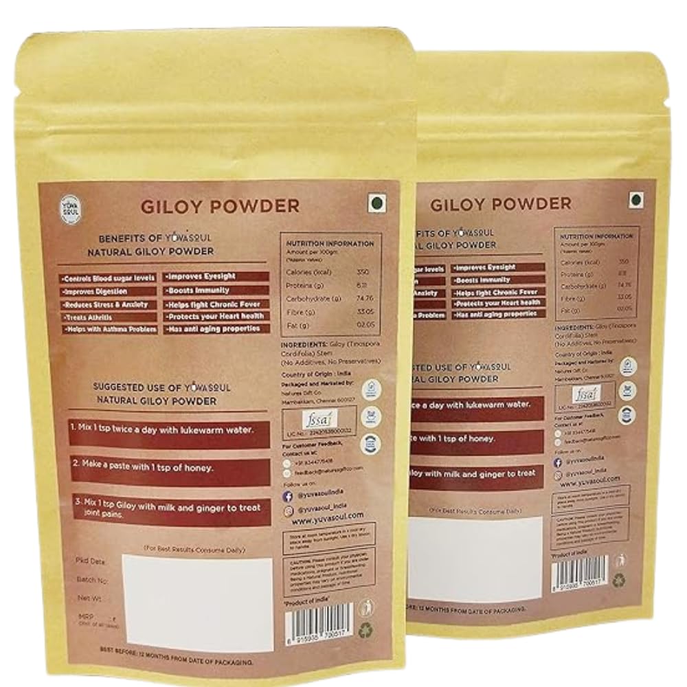 YuvaSoul Guduchi powder. Guduchi is also called as Giloy and is botanically known as Tinospora cordifolia powder. Guduchi for immunity wellness contains the most natural and effective formulation of trusted natural ingredients.Guduchi powder is made from the stem of Tinospora cordifolia. It has anti-spasmodic anti-microbial anti-osteoporotic anti-inflammatory anti-arthritic immuno-modulatory anti-allergic and anti-diabetic properties.